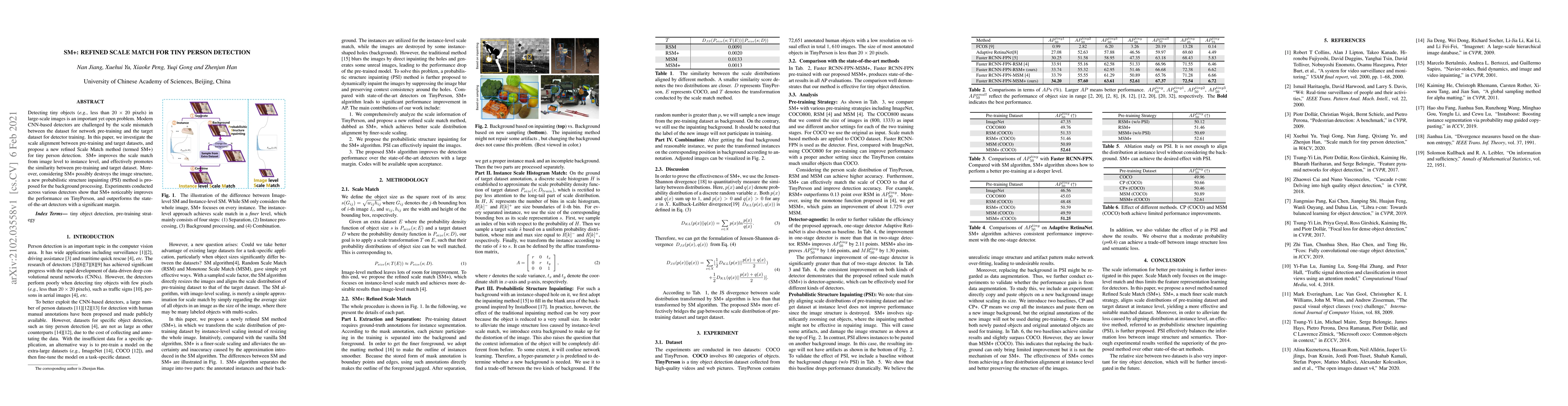 Detecting tiny objects ( e.g., less than 20 x 20 pixels) in large-scale images is an important yet open problem. Modern CNN-based detectors are challenged by the scale mismatch between the dataset for network pre-training and the target dataset for detector training. In this paper, we investigate the scale alignment between pre-training and target datasets, and propose a new refined Scale Match method (termed SM+) for tiny person detection. SM+ improves the scale match from image level to instance level, and effectively promotes the similarity between pre-training and target dataset. Moreover, considering SM+ possibly destroys the image structure, a new probabilistic structure inpainting (PSI) method is proposed for the background processing. Experiments conducted across various detectors show that SM+ noticeably improves the performance on TinyPerson, and outperforms the state-of-the-art detectors with a significant margin.