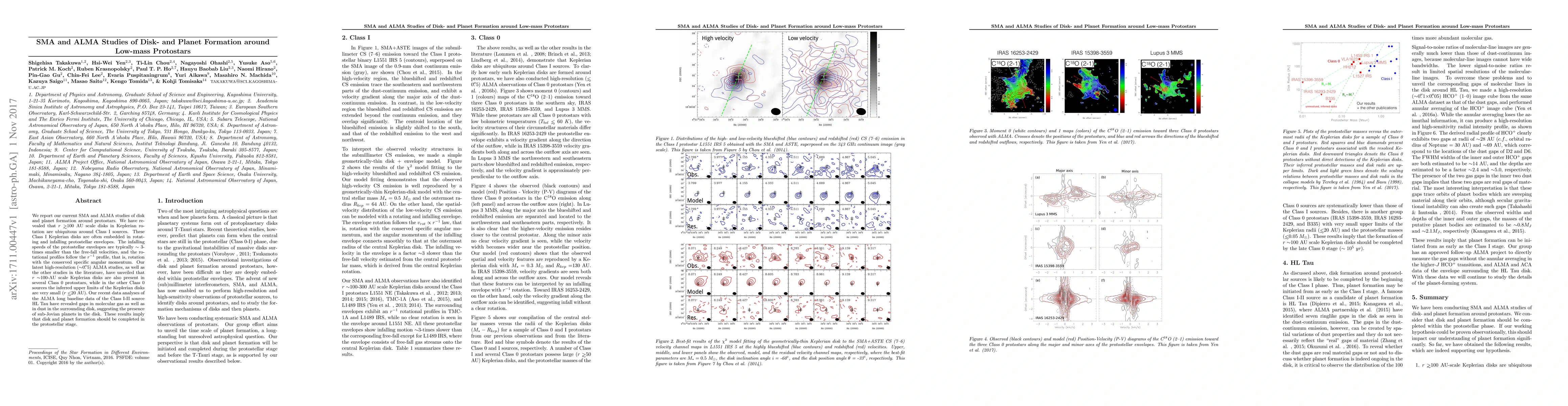 We report our current SMA and ALMA studies of disk and planet formation around protostars. We have revealed that $r \gtrsim$100 AU scale disks in Keplerian rotation are ubiquitous around Class I sources. These Class I Keplerian disks are often embedded in rotating and infalling protostellar envelopes. The infalling speeds of the protostellar envelopes are typically $\sim$ 3-times smaller than the free-fall velocities, and the rotational profiles follow the $r^{-1}$ profile, that is, rotation with the conserved specific angular momentum. Our latest high-resolution ($\sim$0$\farcs$5) ALMA studies, as well as the other studies in the literature, have unveiled that $r \sim$100-AU scale Keplerian disks are also present in several Class 0 protostars, while in the other Class 0 sources the inferred upper limits of the Keplerian disks are very small ($r \lessim$20 AU). Our recent data analyses of the ALMA long baseline data of the Class I-II source HL Tau have revealed gaps in molecular gas as well as in dust in the surrounding disk, suggesting the presence of sub-Jovian planets in the disk. These results imply that disk and planet formation should be completed in the protostellar stage.