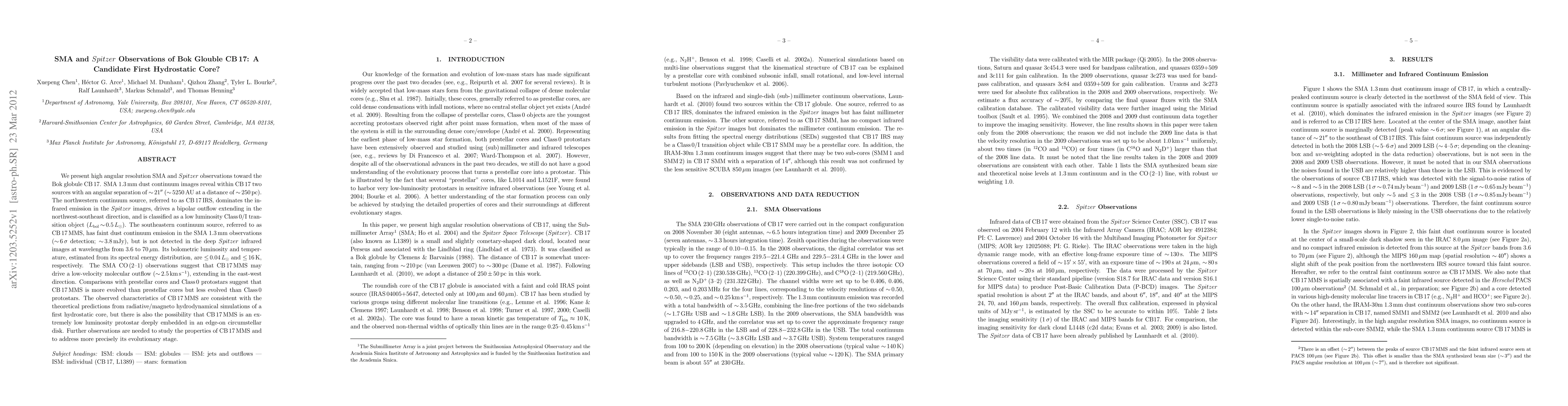We present high angular resolution SMA and Spitzer observations toward the Bok globule CB17. SMA 1.3mm dust continuum images reveal within CB17 two sources with an angular separation of about 21" (about 5250 AU at a distance of 250 pc). The northwestern continuum source, referred to as CB17 IRS, dominates the infrared emission in the Spitzer images, drives a bipolar outflow extending in the northwest-southeast direction, and is classified as a low luminosity Class0/I transition object (L_bol ~ 0.5 L_sun). The southeastern continuum source, referred to as CB17 MMS, has faint dust continuum emission in the SMA 1.3mm observations (about 6 sigma detection; ~3.8 mJy), but is not detected in the deep Spitzer infrared images at wavelengths from 3.6 to 70 micron. Its bolometric luminosity and temperature, estimated from its spectral energy distribution, are less than 0.04 L_sun and 16 K, respectively. The SMA CO(2-1) observations suggest that CB17 MMS may drive a low-velocity molecular outflow (about 2.5 km/s), extending in the east-west direction. Comparisons with prestellar cores and Class0 protostars suggest that CB17 MMS is more evolved than prestellar cores but less evolved than Class0 protostars. The observed characteristics of CB17 MMS are consistent with the theoretical predictions from radiative/magneto hydrodynamical simulations of a first hydrostatic core, but there is also the possibility that CB17 MMS is an extremely low luminosity protostar deeply embedded in an edge-on circumstellar disk. Further observations are needed to study the properties of CB17 MMS and to address more precisely its evolutionary stage.