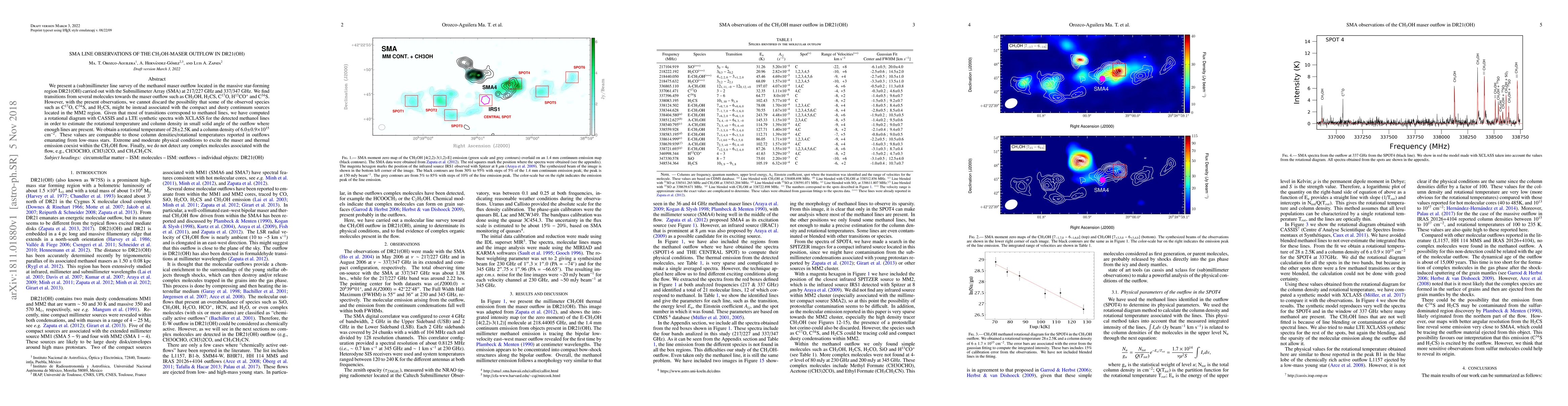 We present a (sub)millimeter line survey of the methanol maser outflow located in the massive star-forming region DR21(OH) carried out with the Submillimeter Array (SMA) at 217/227 GHz and 337/347 GHz. We find transitions from several molecules towards the maser outflow such as CH$_3$OH, H$_2$CS, C$^{17}$O, H$^{13}$CO$^+$ and C$^{34}$S. However, with the present observations, we cannot discard the possibility that some of the observed species such as C$^{17}$O, C$^{34}$S, and H$_2$CS, might be instead associated with the compact and dusty continuum sources located in the MM2 region. Given that most of transitions correspond to methanol lines, we have computed a rotational diagram with CASSIS and a LTE synthetic spectra with XCLASS for the detected methanol lines in order to estimate the rotational temperature and column density in small solid angle of the outflow where enough lines are present. We obtain a rotational temperature of $28\pm 2.5$K and a column density of $6.0\pm 0.9 \times 10^{15}$ cm$^{-2}$. These values are comparable to those column densities/rotational temperatures reported in outflows emanating from low-mass stars. Extreme and moderate physical conditions to excite the maser and thermal emission coexist within the CH$_3$OH flow. Finally, we do not detect any complex molecules associated with the flow, e.g., CH3OCHO, (CH3)2CO, and CH$_3$CH$_2$CN.