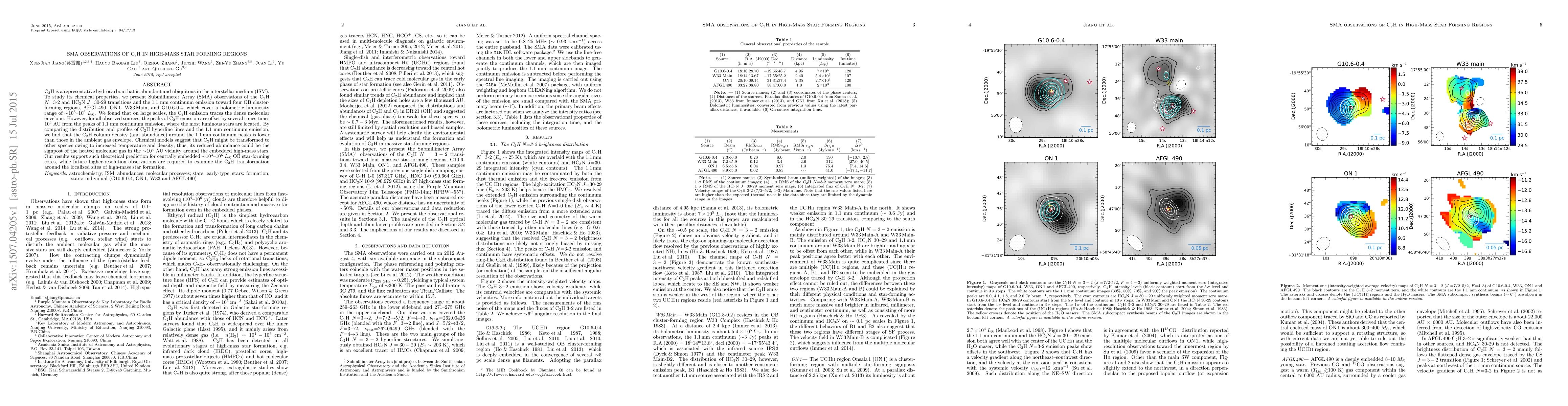 C$_2$H is a representative hydrocarbon that is abundant and ubiquitous in the interstellar medium (ISM). To study its chemical properties, we present Submillimeter Array (SMA) observations of the C$_2$H $N=3-2$ and HC$_3$N $J=30-29$ transitions and the 1.1 mm continuum emission toward four OB cluster-forming regions, AFGL 490, ON 1, W33 Main, and G10.6-0.4, which cover a bolometric luminosity range of $\sim$10$^3$--10$^6$ $L_{\odot}$. We found that on large scales, the C$_2$H emission traces the dense molecular envelope. However, for all observed sources, the peaks of C$_2$H emission are offset by several times times 10$^4$ AU from the peaks of 1.1 mm continuum emission, where the most luminous stars are located. By comparing the distribution and profiles of C$_2$H hyperfine lines and the 1.1 mm continuum emission, we find that the C$_2$H column density (and abundance) around the 1.1 mm continuum peaks is lower than those in the ambient gas envelope. Chemical models suggest that C$_2$H might be transformed to other species owing to increased temperature and density; thus, its reduced abundance could be the signpost of the heated molecular gas in the $\sim$10$^4$ AU vicinity around the embedded high-mass stars. Our results support such theoretical prediction for centrally embedded $\sim10^3$--$10^6L_{\odot}$ OB star-forming cores, while future higher-resolution observations are required to examine the C$_2$H transformation around the localized sites of high-mass star formation.