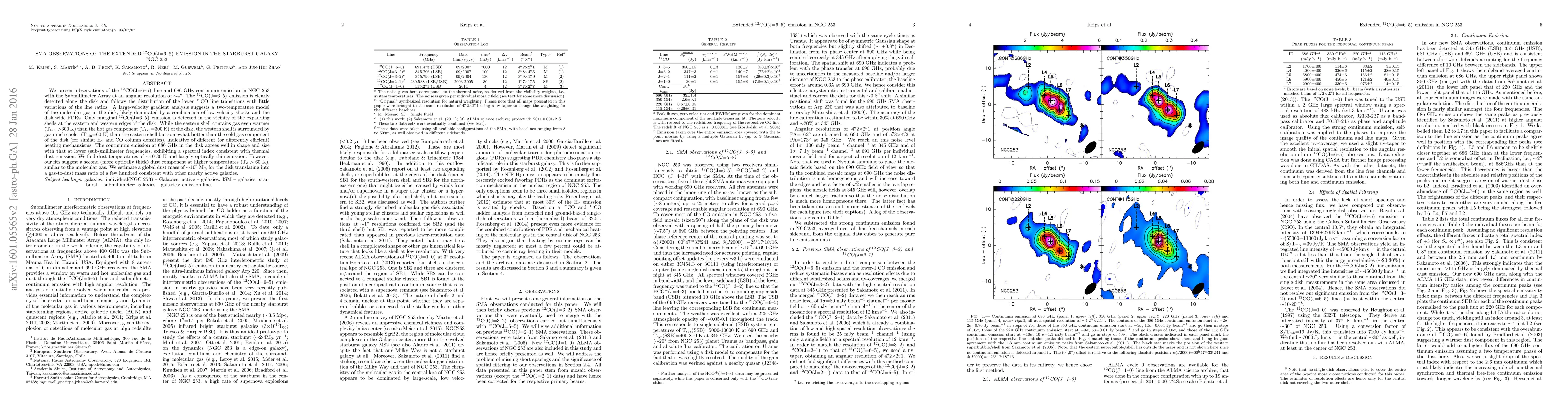 We present observations of the $^{12}$CO(6-5) line and 686GHz continuum emission in NGC253 with the Submillimeter Array at an angular resolution of ~4arcsec. The $^{12}$CO(6-5) emission is clearly detected along the disk and follows the distribution of the lower $^{12}$CO line transitions with little variations of the line ratios in it. A large-velocity gradient analysis suggests a two-temperature model of the molecular gas in the disk, likely dominated by a combination of low-velocity shocks and the disk wide PDRs. Only marginal $^{12}$CO(6-5) emission is detected in the vicinity of the expanding shells at the eastern and western edges of the disk. While the eastern shell contains gas even warmer (T$_{\rm kin}$>300~K) than the hot gas component (T$_{\rm kin}$=300K) of the disk, the western shell is surrounded by gas much cooler (T$_{\rm kin}$=60K) than the eastern shell but somewhat hotter than the cold gas component of the disk (for similar H$_2$ and CO column densities), indicative of different (or differently efficient) heating mechansisms. The continuum emission at 686GHz in the disk agrees well in shape and size with that at lower (sub-)millimeter frequencies, exhibiting a spectral index consistent with thermal dust emission. We find dust temperatures of ~10-30K and largely optically thin emission. However, our fits suggest a second (more optically thick) dust component at higher temperatures (T$_{\rm d}$>60K), similar to the molecular gas. We estimate a global dust mass of ~10$^6$Msun for the disk translating into a gas-to-dust mass ratio of a few hundred consistent with other nearby active galaxies.