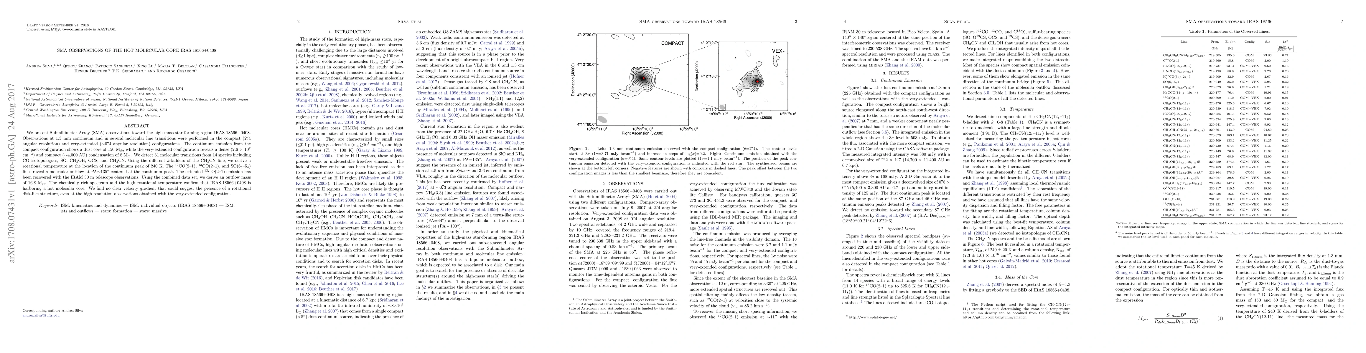 We present Submillimeter Array (SMA) observations toward the high-mass star-forming region IRAS 18566+0408. Observations at 1.3 mm continuum and in several molecular line transitions were performed in the compact (2."4 angular resolution) and very-extended (~0."4 angular resolution) configurations. The continuum emission from the compact configuration shows a dust core of 150 Msun, while the very-extended configuration reveals a dense (2.6 x 10^7 cm^-3) and compact (~4,000 AU) condensation of 8 Msun. We detect 31 molecular transitions from 14 species including CO isotopologues, SO, CH3OH, OCS, and CH3CN. Using the different k-ladders of the CH3CN line, we derive a rotational temperature at the location of the continuum peak of 240 K. The 12CO(2-1), 13CO(2-1), and SO(6_5-5_4) lines reveal a molecular outflow at PA ~135^o centered at the continuum peak. The extended 12CO(2-1) emission has been recovered with the IRAM 30 m telescope observations. Using the combined data set, we derive an outflow mass of 16.8 Msun. The chemically rich spectrum and the high rotational temperature confirm that IRAS 18566+0408 is harboring a hot molecular core. We find no clear velocity gradient that could suggest the presence of a rotational disk-like structure, even at the high resolution observations obtained with the very-extended configuration.