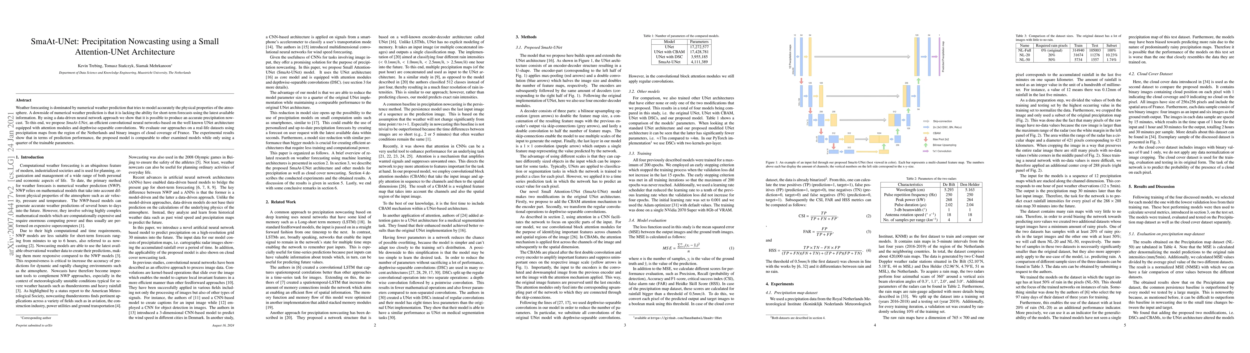 The paper proposes SmaAt-UNet, a small attention-enhanced UNet architecture for accurate short-term precipitation nowcasting. The model achieves comparable performance to other methods while using significantly fewer parameters, demonstrated through experiments on precipitation and cloud coverage datasets.