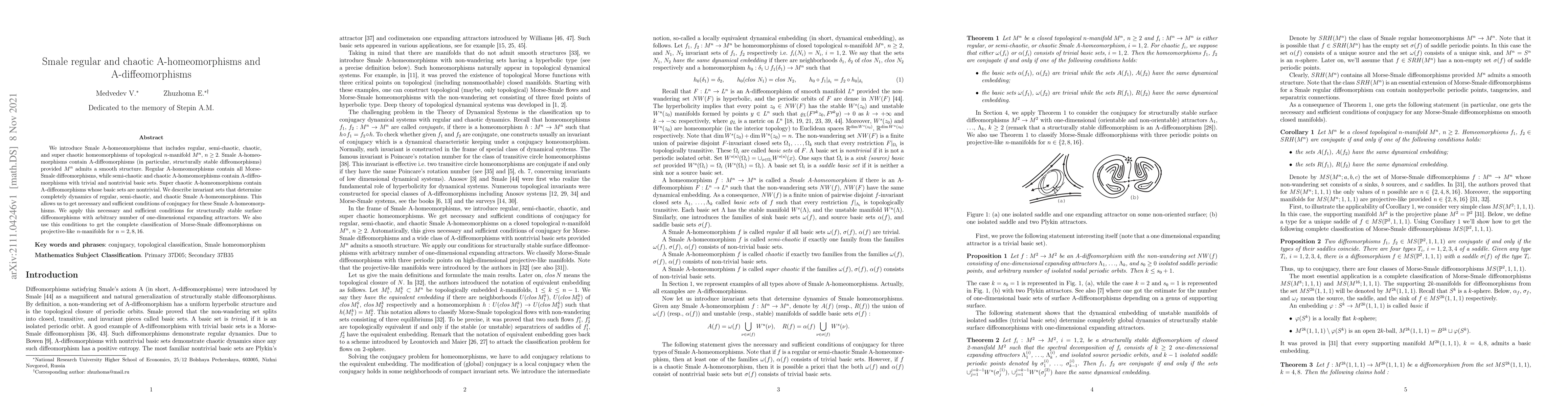 This paper introduces Smale A-homeomorphisms encompassing various types of chaotic behaviors on $n$-manifolds, including regular, semi-chaotic, chaotic, and super chaotic forms. It provides necessary and sufficient conditions for conjugacy among these homeomorphisms and applies them to classify structurally stable surface diffeomorphisms and Morse-Smale diffeomorphisms on specific projective-like $n$-manifolds.