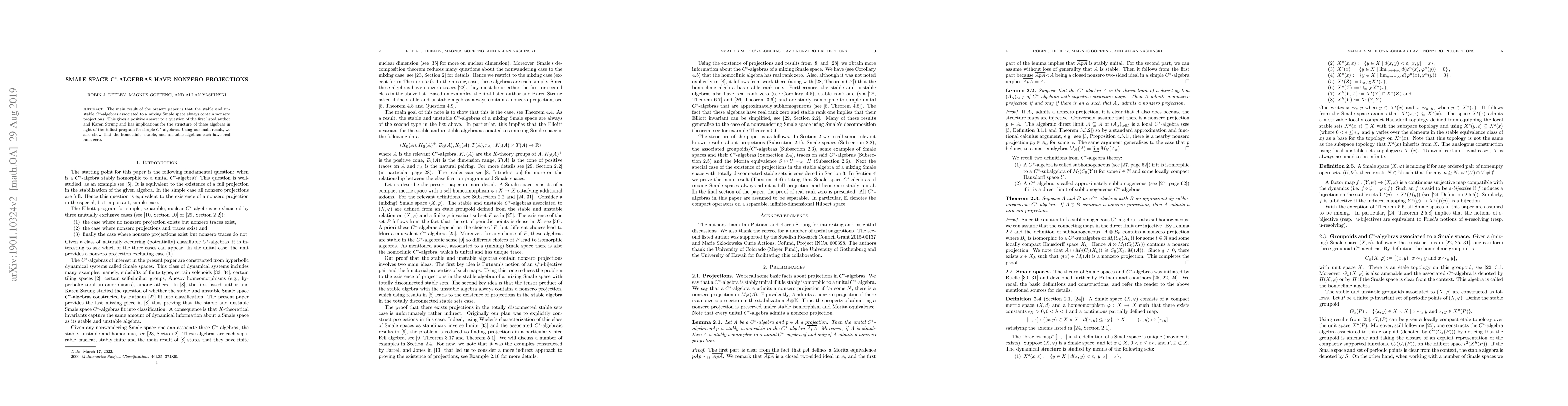 The main result of the present paper is that the stable and unstable C*-algebras associated to a mixing Smale space always contain nonzero projections. This gives a positive answer to a question of the first listed author and Karen Strung and has implications for the structure of these algebras in light of the Elliott program for simple C*-algebras. Using our main result, we also show that the homoclinic, stable, and unstable algebras each have real rank zero.