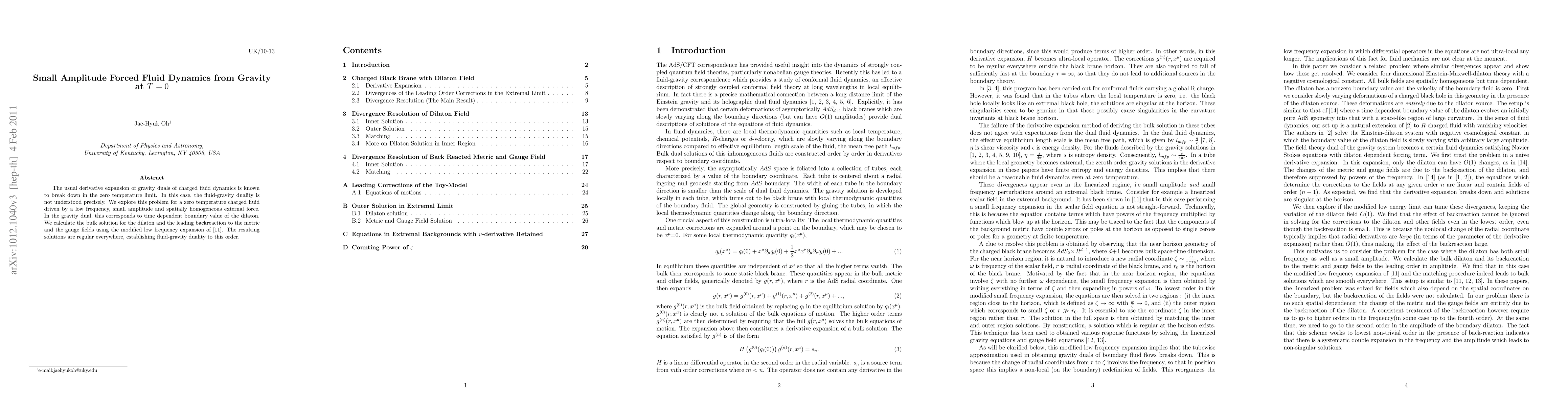 The usual derivative expansion of gravity duals of charged fluid dynamics is known to break down in the zero temperature limit. In this case, the fluid-gravity duality is not understood precisely. We explore this problem for a zero temperature charged fluid driven by a low frequency, small amplitude and spatially homogeneous external force. In the gravity dual, this corresponds to time dependent boundary value of the dilaton. We calculate the bulk solution for the dilaton and the leading backreaction to the metric and the gauge fields using the modified low frequency expansion of [11]. The resulting solutions are regular everywhere, establishing fluid-gravity duality to this order.