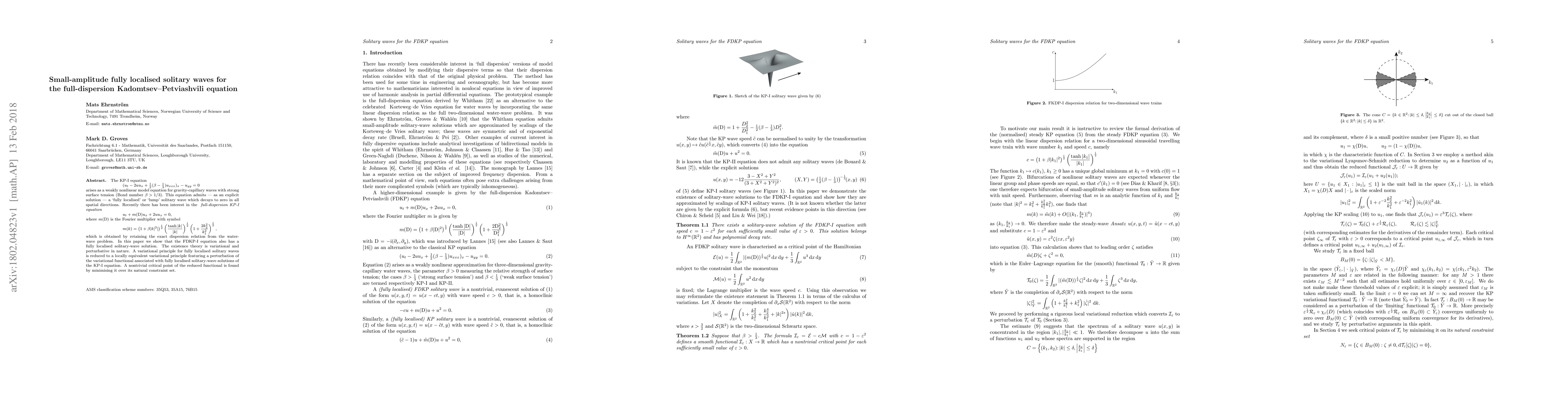 The KP-I equation \[ (u_t-2uu_x+\tfrac{1}{2}(\beta-\tfrac{1}{3})u_{xxx})_x -u_{yy}=0 \] arises as a weakly nonlinear model equation for gravity-capillary waves with strong surface tension (Bond number $\beta>1/3$). This equation admits --- as an explicit solution --- a `fully localised' or `lump' solitary wave which decays to zero in all spatial directions. Recently there has been interest in the \emph{full-dispersion KP-I equation} \[u_t + m({\mathrm D}) u_x + 2 u u_x = 0,\] where $m({\mathrm D})$ is the Fourier multiplier with symbol \[ m(k) = \left( 1 + \beta |k|^2|\right)^{\frac{1}{2}} \left( \frac{\tanh |k|}{|k|} \right)^{\frac{1}{2}} \left( 1 + \frac{2k_2^2}{k_1^2} \right)^{\frac{1}{2}}, \] which is obtained by retaining the exact dispersion relation from the water-wave problem. In this paper we show that the FDKP-I equation also has a fully localised solitary-wave solution. The existence theory is variational and perturbative in nature. A variational principle for fully localised solitary waves is reduced to a locally equivalent variational principle featuring a perturbation of the variational functional associated with fully localised solitary-wave solutions of the {KP-I} equation. A nontrivial critical point of the reduced functional is found by minimising it over its natural constraint set.