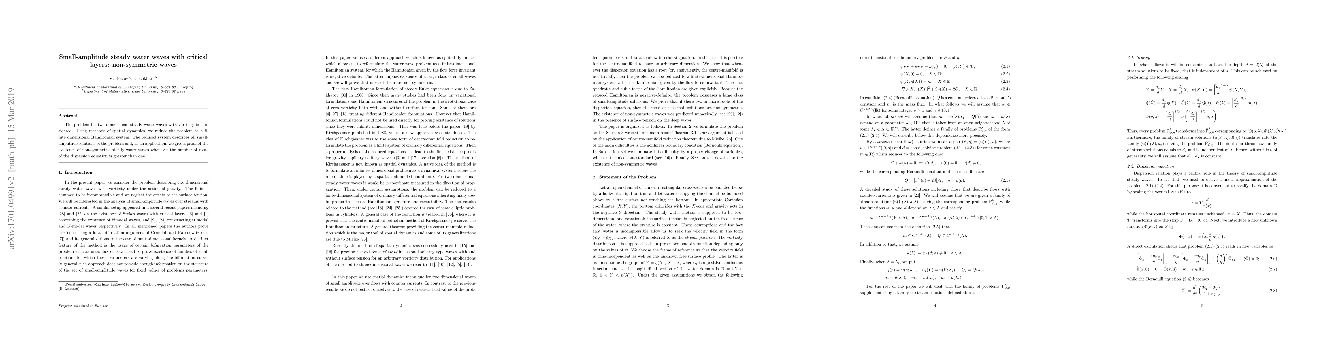 This paper explores two-dimensional steady water waves with vorticity, reducing the problem to a finite-dimensional Hamiltonian system using spatial dynamics. It demonstrates the existence of non-symmetric steady water waves when the dispersion equation has more than one root.