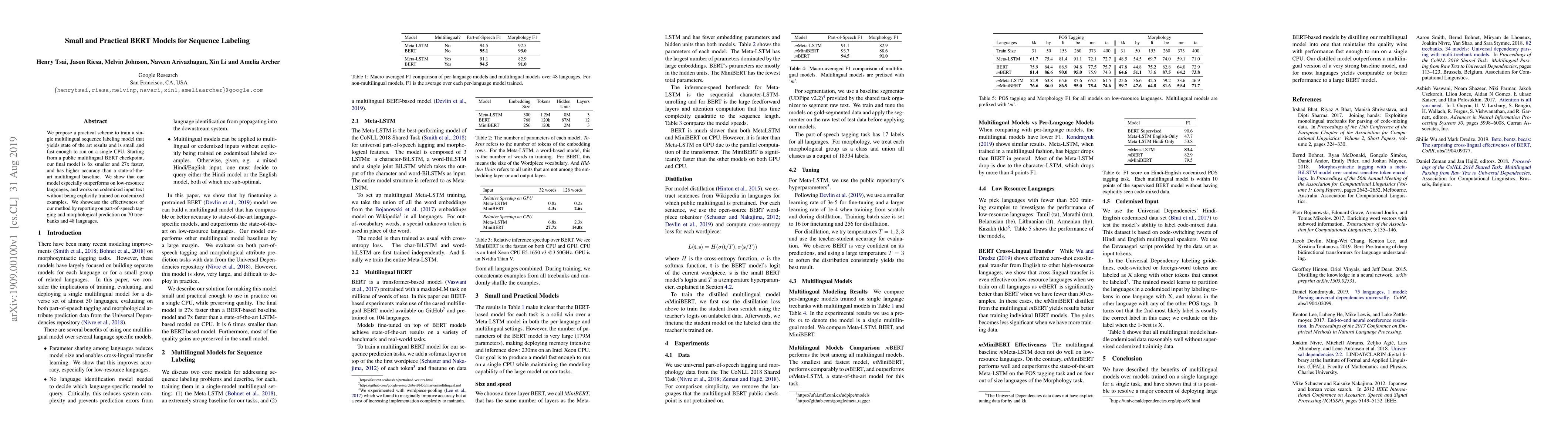We propose a practical scheme to train a single multilingual sequence labeling model that yields state of the art results and is small and fast enough to run on a single CPU. Starting from a public multilingual BERT checkpoint, our final model is 6x smaller and 27x faster, and has higher accuracy than a state-of-the-art multilingual baseline. We show that our model especially outperforms on low-resource languages, and works on codemixed input text without being explicitly trained on codemixed examples. We showcase the effectiveness of our method by reporting on part-of-speech tagging and morphological prediction on 70 treebanks and 48 languages.
