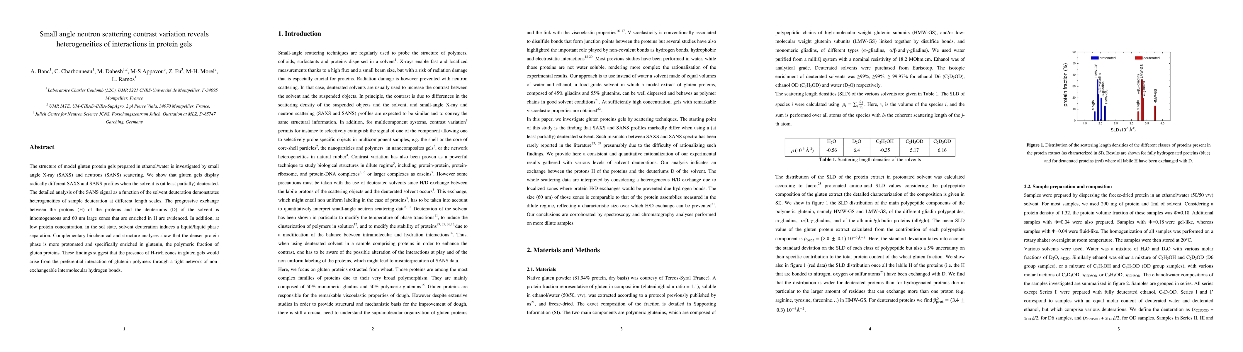 Small angle neutron scattering reveals heterogeneities in gluten protein gels, showing inhomogeneous deuteration and H-rich zones enriched in glutenin polymers. The findings suggest a tight network of non-exchangeable hydrogen bonds in the denser protein phase.