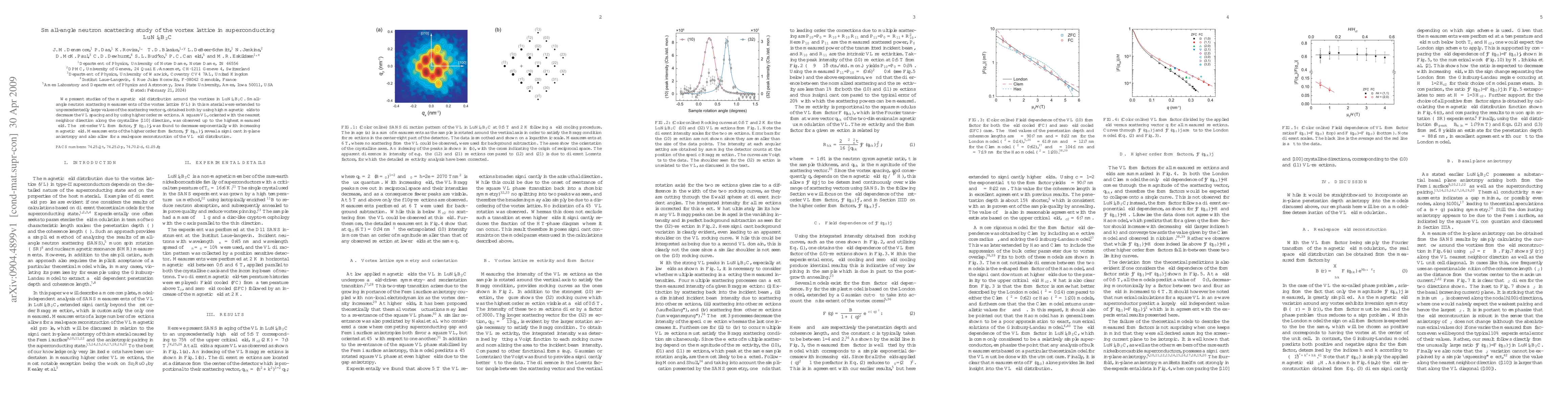 This study used small-angle neutron scattering to map the magnetic field distribution around vortices in a superconducting material, revealing an exponential decrease in the first-order form factor with increasing magnetic field and significant in-plane anisotropy.