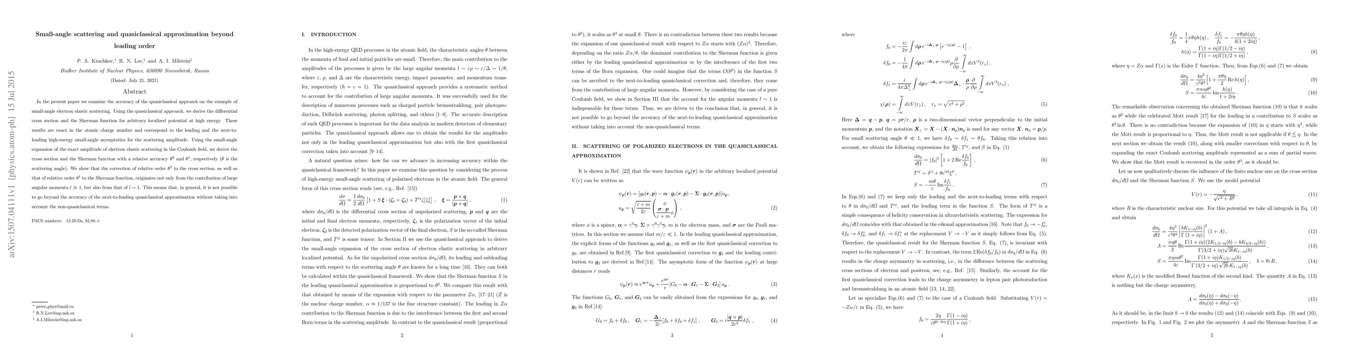 This paper evaluates the quasiclassical approach's accuracy in small-angle electron scattering, deriving differential cross sections and Sherman functions. It finds that corrections beyond the leading quasiclassical approximation require considering non-quasiclassical terms, especially for angular momenta around $l\sim 1$.