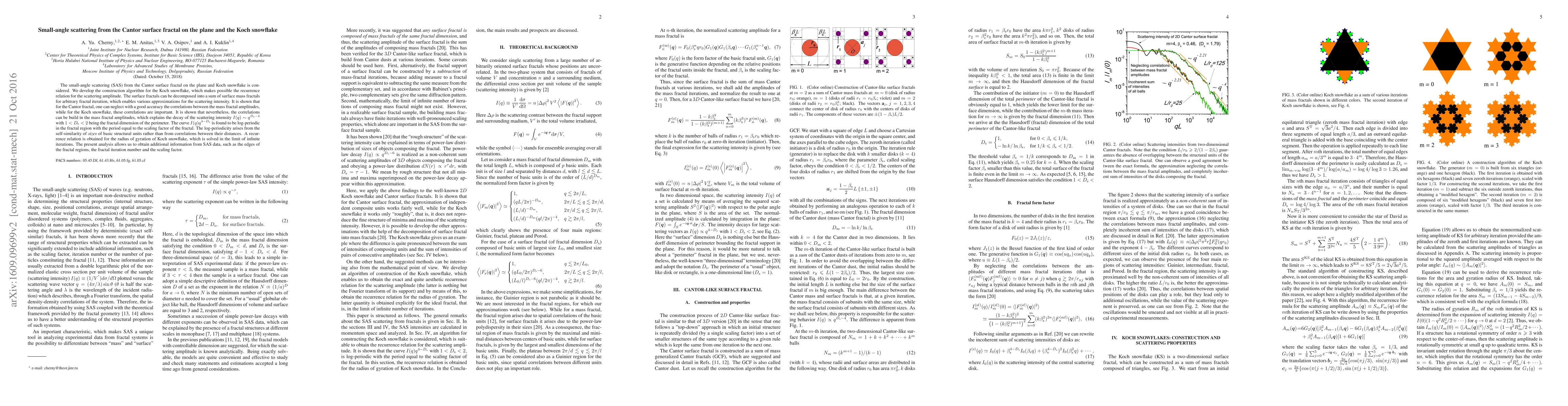 The small-angle scattering (SAS) from the Cantor surface fractal on the plane and Koch snowflake is considered. We develop the construction algorithm for the Koch snowflake, which makes possible the recurrence relation for the scattering amplitude. The surface fractals can be decomposed into a sum of surface mass fractals for arbitrary fractal iteration, which enables various approximations for the scattering intensity. It is shown that for the Cantor fractal, one can neglect with a good accuracy the correlations between the mass fractal amplitudes, while for the Koch snowflake, these correlations are important. It is shown that nevertheless, the correlations can be build in the mass fractal amplitudes, which explains the decay of the scattering intensity $I(q)\sim q^{D_{\mathrm{s}}-4}$ with $1 < D_{\mathrm{s}} < 2$ being the fractal dimension of the perimeter. The curve $I(q)q^{4-D_{\mathrm{s}}}$ is found to be log-periodic in the fractal region with the period equal to the scaling factor of the fractal. The log-periodicity arises from the self-similarity of sizes of basic structural units rather than from correlations between their distances. A recurrence relation is obtained for the radius of gyration of Koch snowflake, which is solved in the limit of infinite iterations. The present analysis allows us to obtain additional information from SAS data, such as the edges of the fractal regions, the fractal iteration number and the scaling factor.