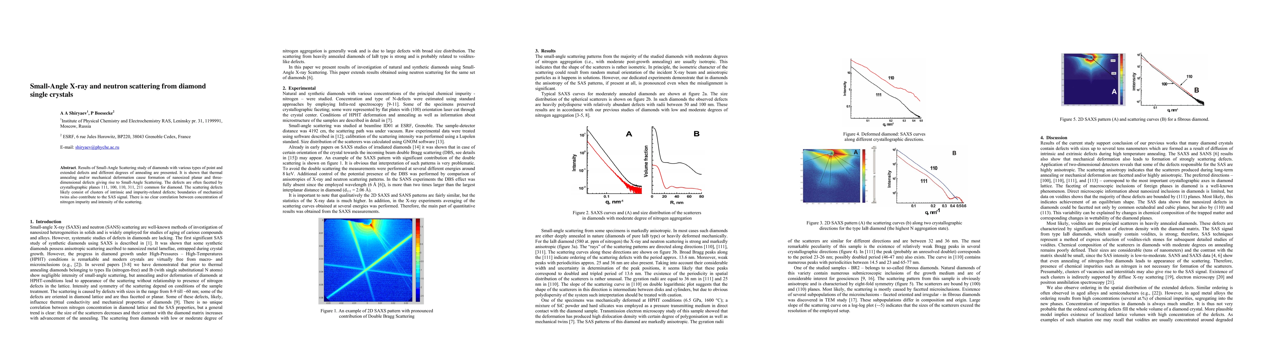 Small-Angle X-ray and neutron scattering studies diamond single crystals with defects formed through thermal annealing and mechanical deformation. These defects contribute to the SAS signal and do not correlate with nitrogen impurity concentration.