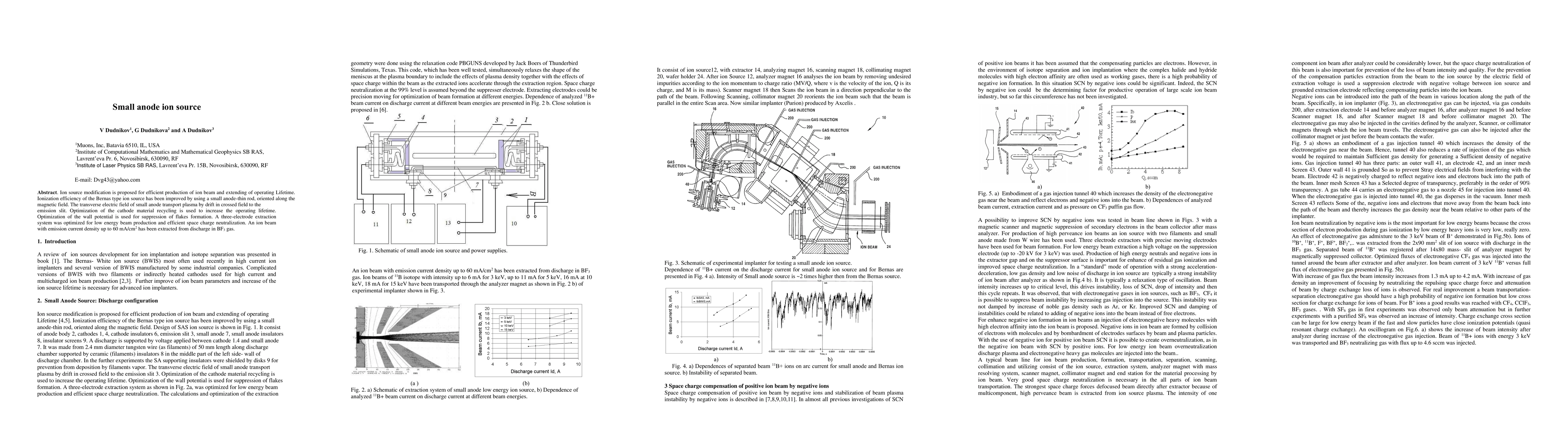 Ion source modification is proposed for efficient production of ion beam and extending of operating Lifetime. Ionization efficiency of the Bernas type ion source has been improved by using a small anode-thin rod, oriented along the magnetic field. The transverse electric field of small anode transport plasma by drift in crossed field to the emission slit. Optimization of the cathode material recycling is used to increase the operating lifetime. Optimization of the wall potential is used for suppression of flakes formation. A three-electrode extraction system was optimized for low energy beam production and efficient space charge neutralization. An ion beam with emission current density up to 60 mA/cm2 has been extracted from discharge in BF3 gas.