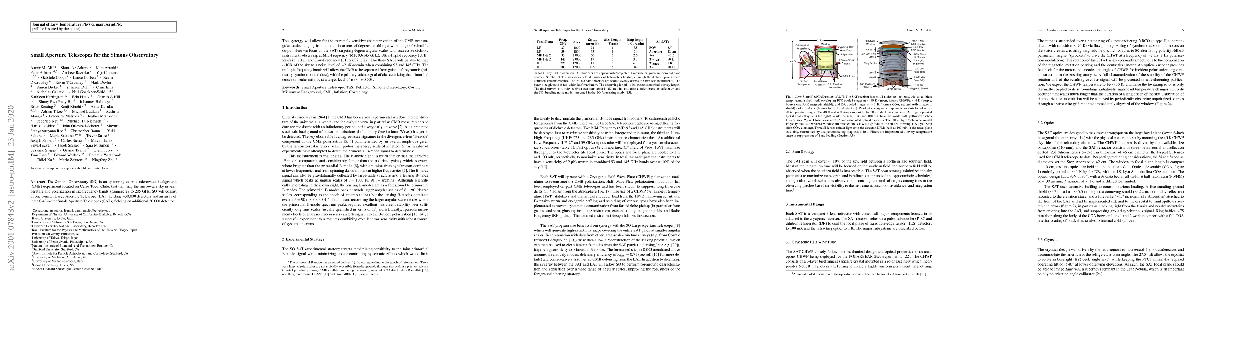 The Simons Observatory's Small Aperture Telescopes (SATs) will map the cosmic microwave background (CMB) across three frequency bands, aiming to characterize the primordial tensor-to-scalar ratio $r$ at a precision of $\sigma(r) \approx 0.003$ by separating CMB from galactic foregrounds. The SATs will cover ~10% of the sky with a noise level of 2 $\mu$K-arcmin.