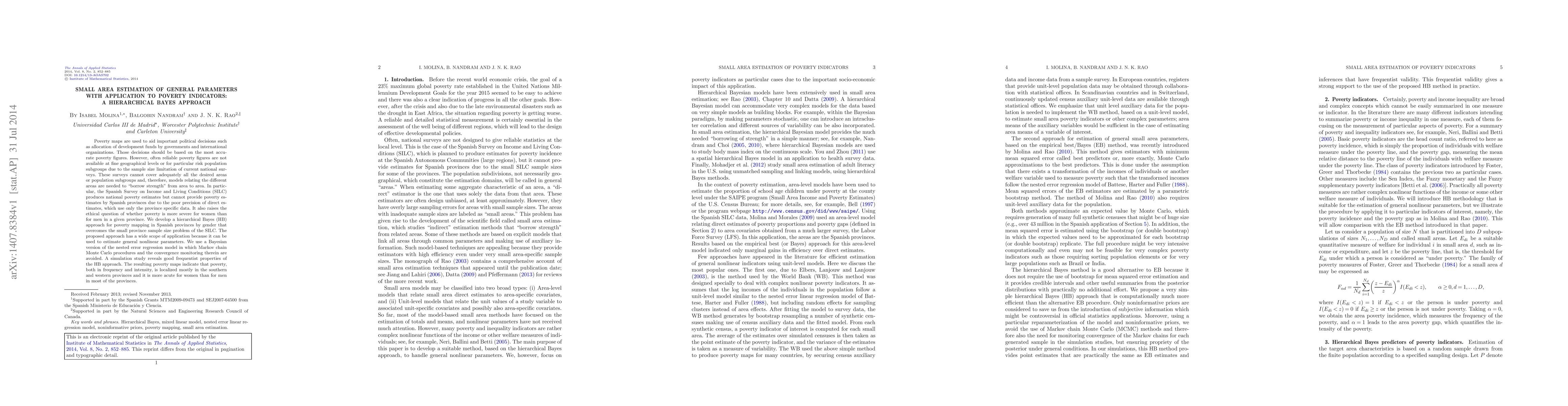 This paper develops a hierarchical Bayes approach to estimate poverty indicators at fine geographical levels, addressing the limitations of national surveys in small areas. The method provides more accurate poverty estimates by borrowing strength across areas, revealing higher poverty rates for women compared to men in most Spanish provinces.