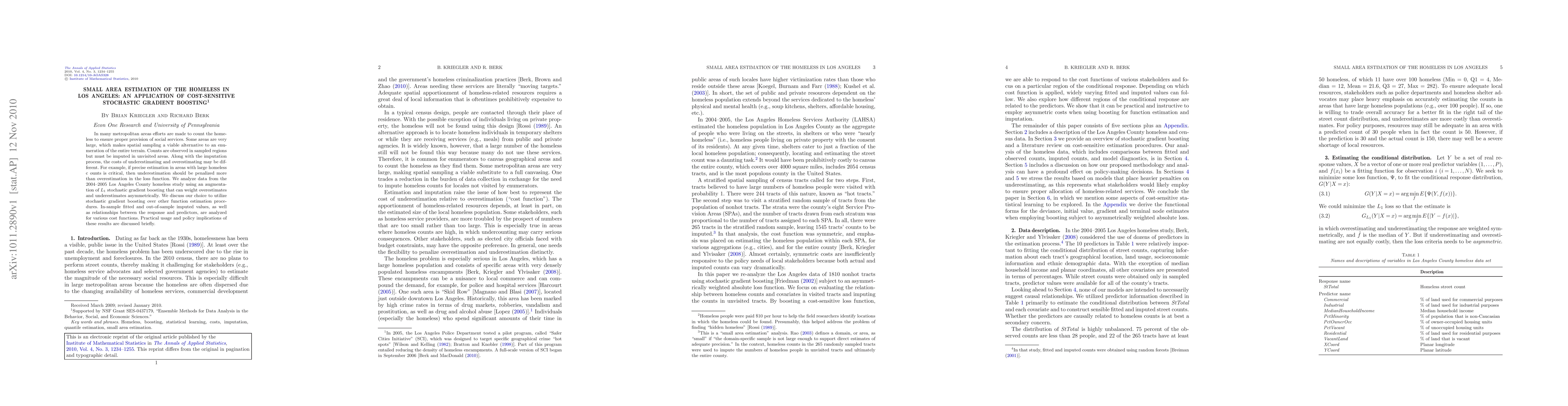 This paper applies cost-sensitive stochastic gradient boosting to estimate the homeless population in different areas of Los Angeles, emphasizing the importance of penalizing underestimations more than overestimations in critical regions. The method is evaluated using data from the 2004-2005 Los Angeles County homeless study, with implications for social service provision discussed.