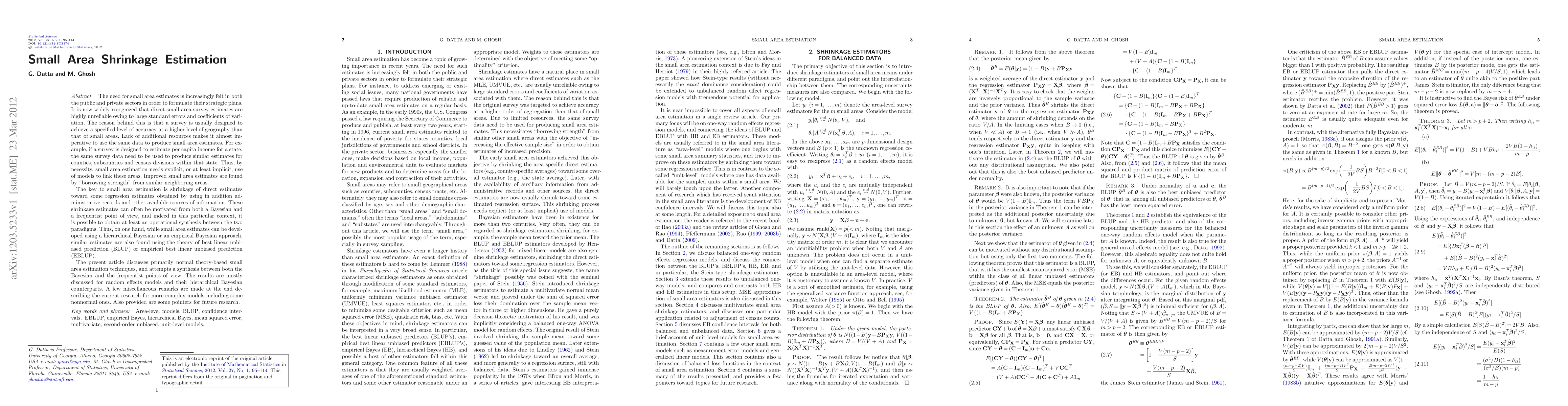 The need for small area estimates is increasingly felt in both the public and private sectors in order to formulate their strategic plans. It is now widely recognized that direct small area survey estimates are highly unreliable owing to large standard errors and coefficients of variation. The reason behind this is that a survey is usually designed to achieve a specified level of accuracy at a higher level of geography than that of small areas. Lack of additional resources makes it almost imperative to use the same data to produce small area estimates. For example, if a survey is designed to estimate per capita income for a state, the same survey data need to be used to produce similar estimates for counties, subcounties and census divisions within that state. Thus, by necessity, small area estimation needs explicit, or at least implicit, use of models to link these areas. Improved small area estimates are found by "borrowing strength" from similar neighboring areas.
