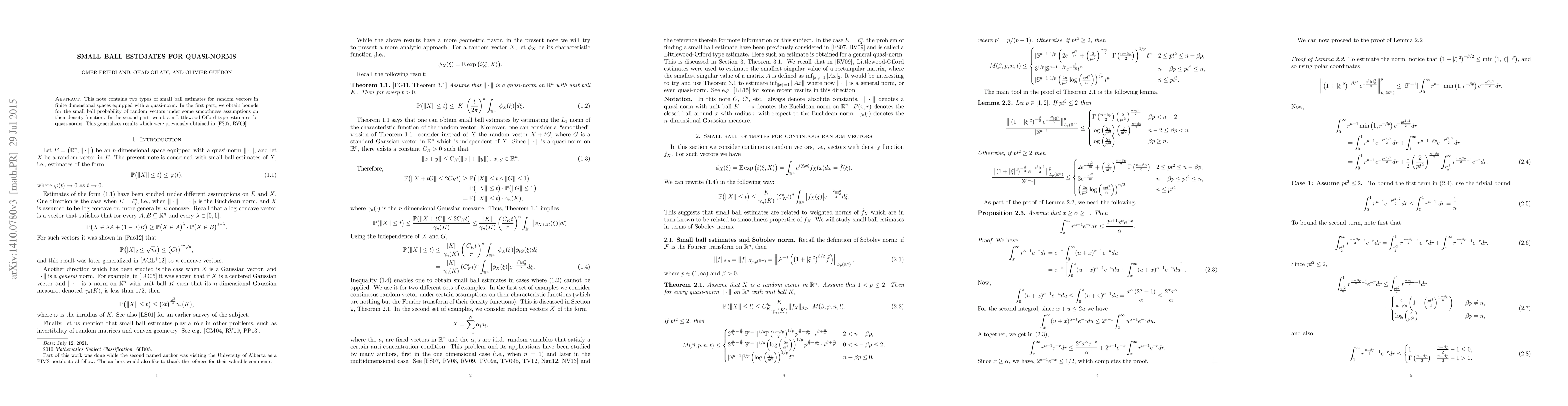 This paper presents small ball estimates for random vectors in finite-dimensional spaces with quasi-norms, providing bounds under smoothness assumptions and Littlewood-Offord type estimates, generalizing prior results by Friedland-Sodin and Rudelson-Vershynin.