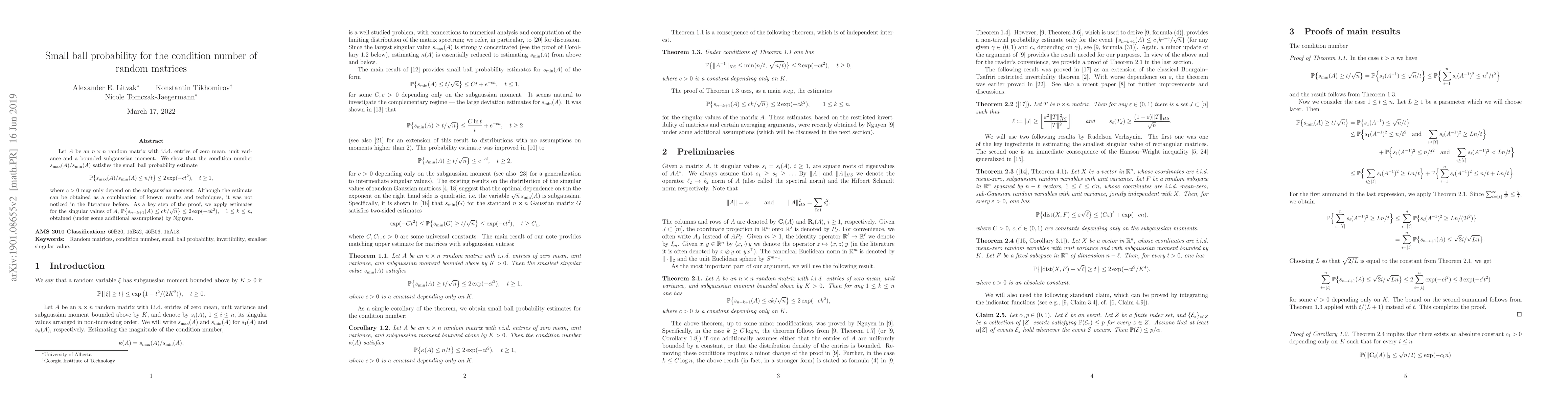 This paper establishes a small ball probability estimate for the condition number of $n\times n$ random matrices with i.i.d. entries, showing that the ratio of the largest to smallest singular values is highly unlikely to be small. The key result is ${\mathbb P}\big\{s_{\max}(A)/s_{\min}(A)\leq n/t\big\}\leq 2\exp(-ct^2)$, where $c>0$ depends on the subgaussian moment.