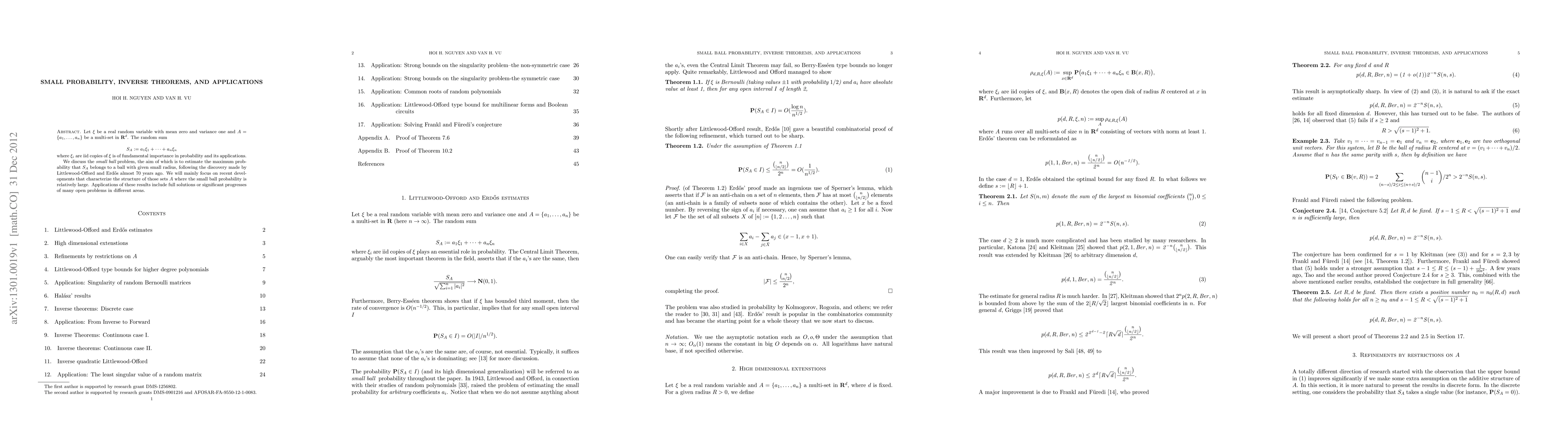 Let $\xi$ be a real random variable with mean zero and variance one and $A={a_1,...,a_n}$ be a multi-set in $\R^d$. The random sum $$S_A := a_1 \xi_1 + ... + a_n \xi_n $$ where $\xi_i$ are iid copies of $\xi$ is of fundamental importance in probability and its applications. We discuss the small ball problem, the aim of which is to estimate the maximum probability that $S_A$ belongs to a ball with given small radius, following the discovery made by Littlewood-Offord and Erdos almost 70 years ago. We will mainly focus on recent developments that characterize the structure of those sets $A$ where the small ball probability is relatively large. Applications of these results include full solutions or significant progresses of many open problems in different areas.