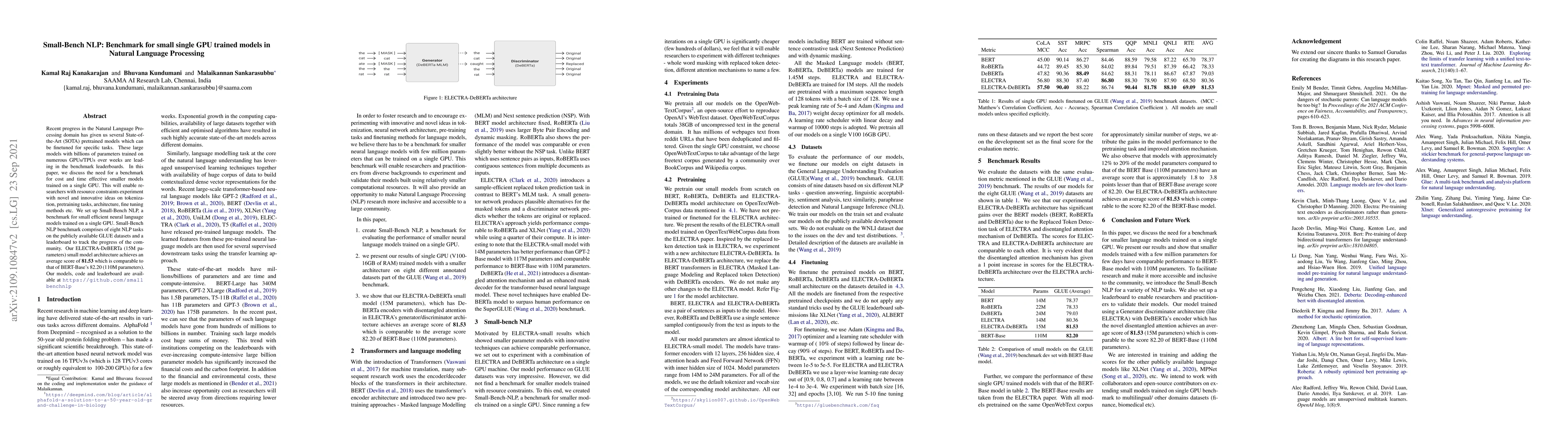 Recent progress in the Natural Language Processing domain has given us several State-of-the-Art (SOTA) pretrained models which can be finetuned for specific tasks. These large models with billions of parameters trained on numerous GPUs/TPUs over weeks are leading in the benchmark leaderboards. In this paper, we discuss the need for a benchmark for cost and time effective smaller models trained on a single GPU. This will enable researchers with resource constraints experiment with novel and innovative ideas on tokenization, pretraining tasks, architecture, fine tuning methods etc. We set up Small-Bench NLP, a benchmark for small efficient neural language models trained on a single GPU. Small-Bench NLP benchmark comprises of eight NLP tasks on the publicly available GLUE datasets and a leaderboard to track the progress of the community. Our ELECTRA-DeBERTa (15M parameters) small model architecture achieves an average score of 81.53 which is comparable to that of BERT-Base's 82.20 (110M parameters). Our models, code and leaderboard are available at https://github.com/smallbenchnlp