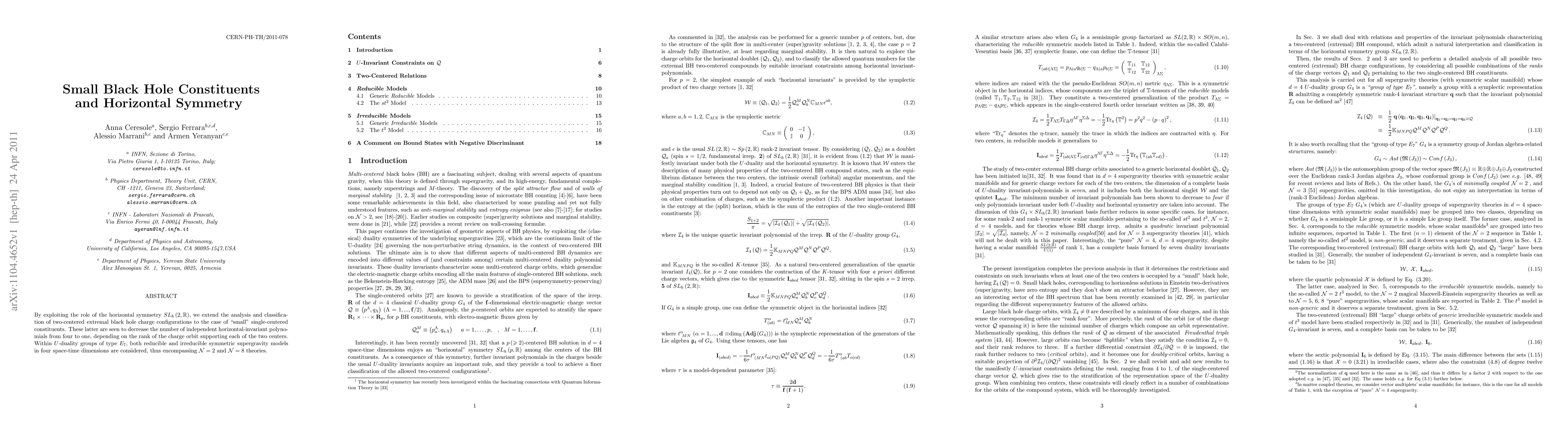 By exploiting the role of the horizontal symmetry SL(2,R), we extend the analysis and classification of two-centered extremal black hole charge configurations to the case of "small" single-centered constituents. These latter are seen to decrease the number of independent horizontal-invariant polynomials from four to one, depending on the rank of the charge orbit supporting each of the two centers. Within U-duality groups of type E7, both reducible and irreducible symmetric supergravity models in four space-time dimensions are considered, thus encompassing N = 2 and N = 8 theories.