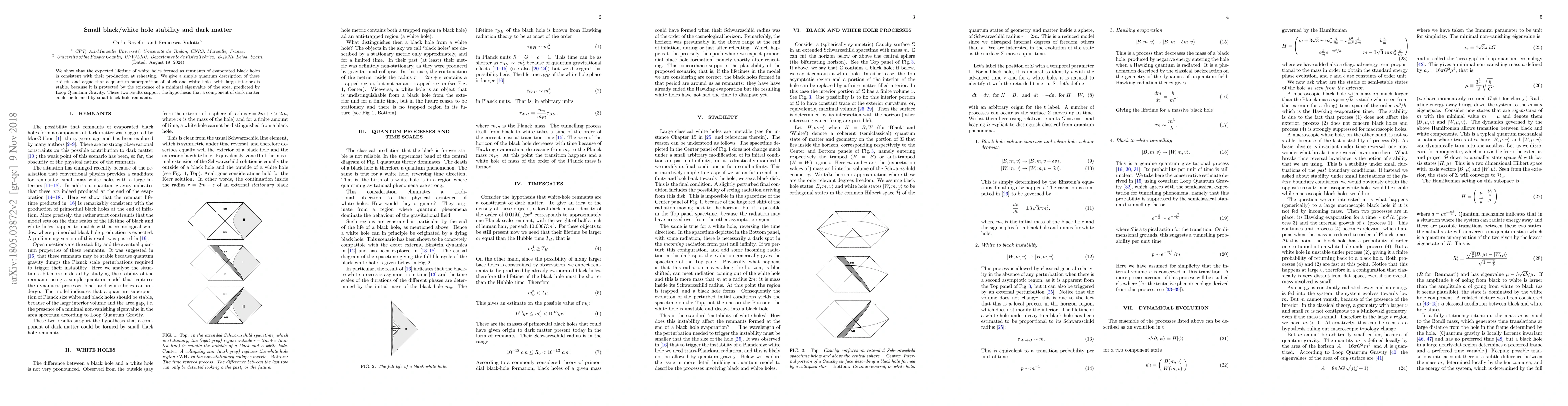 We show that the expected lifetime of white holes formed as remnants of evaporated black holes is consistent with their production at reheating. We give a simple quantum description of these objects and argue that a quantum superposition of black and white holes with large interiors is stable, because it is protected by the existence of a minimal eigenvalue of the area, predicted by Loop Quantum Gravity. These two results support the hypothesis that a component of dark matter could be formed by small black hole remnants.