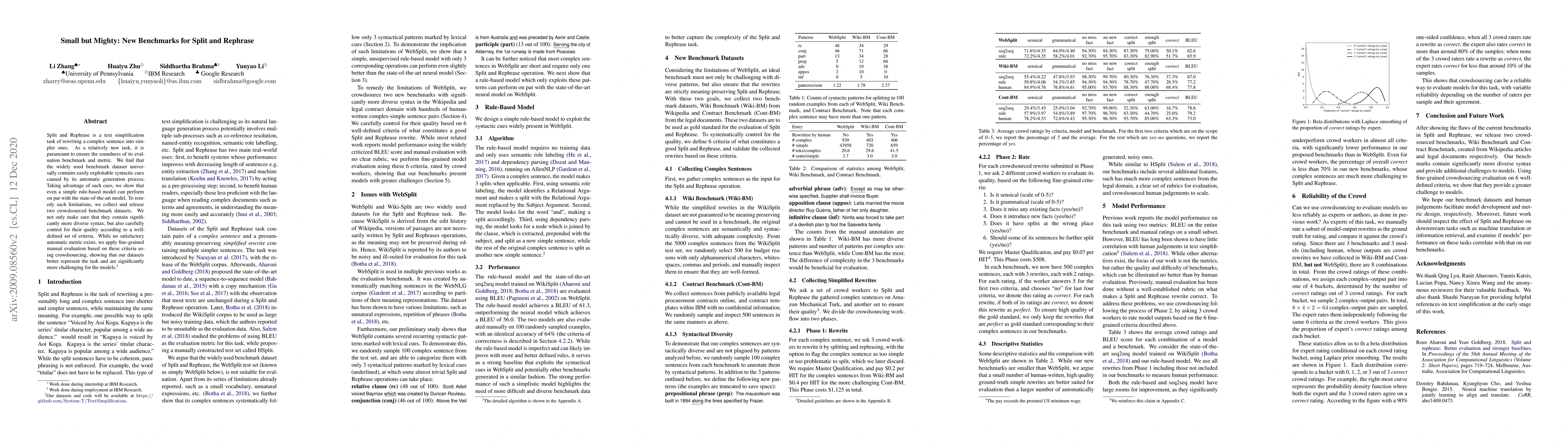 A new benchmark dataset for the text simplification task of Split and Rephrase has been created to address its limitations, showing that simpler models can perform on par with state-of-the-art models.
