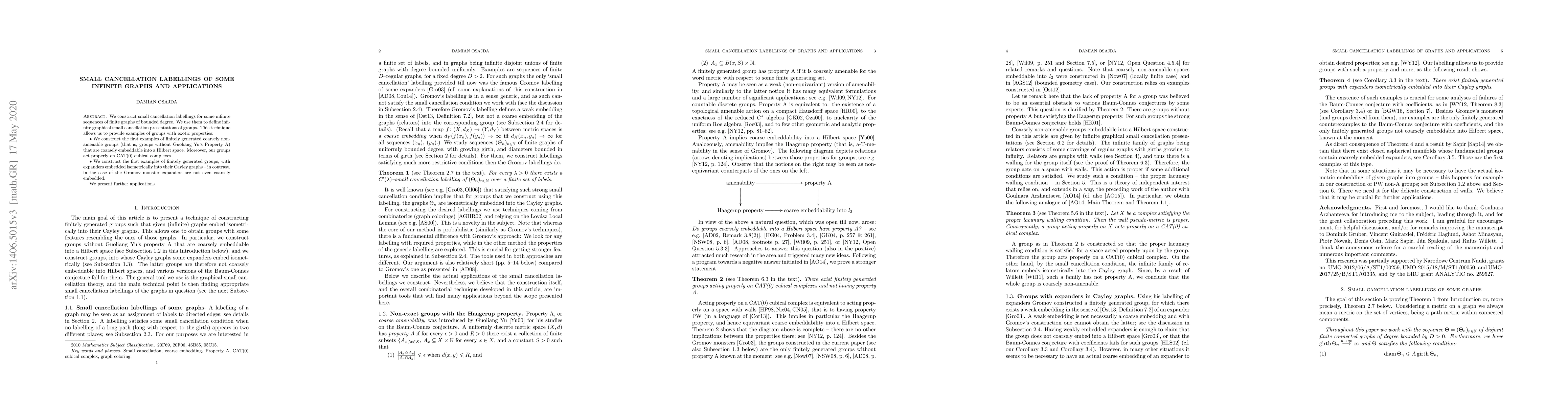 Researchers created infinite graphs with small cancellation labellings to define exotic group presentations, including coarsely non-amenable groups embeddable into Hilbert spaces.