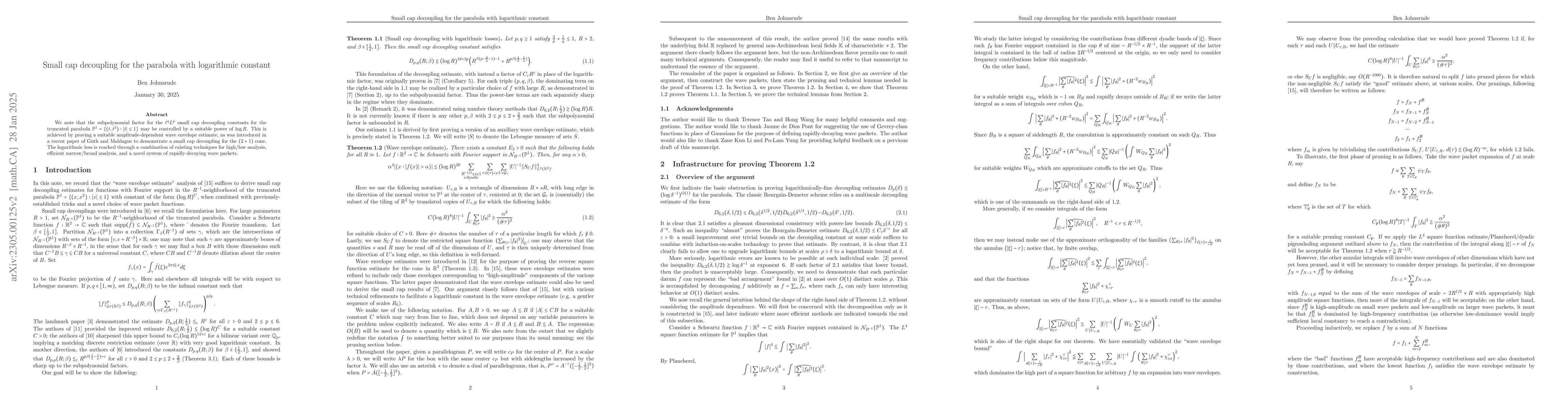 This paper demonstrates that the subpolynomial factor for small cap decoupling constants on the truncated parabola can be controlled by a power of $\log R$. The authors achieve this by adapting an amplitude-dependent wave envelope estimate, similar to techniques used in a recent study by Guth and Maldague for the $(2+1)$ cone.