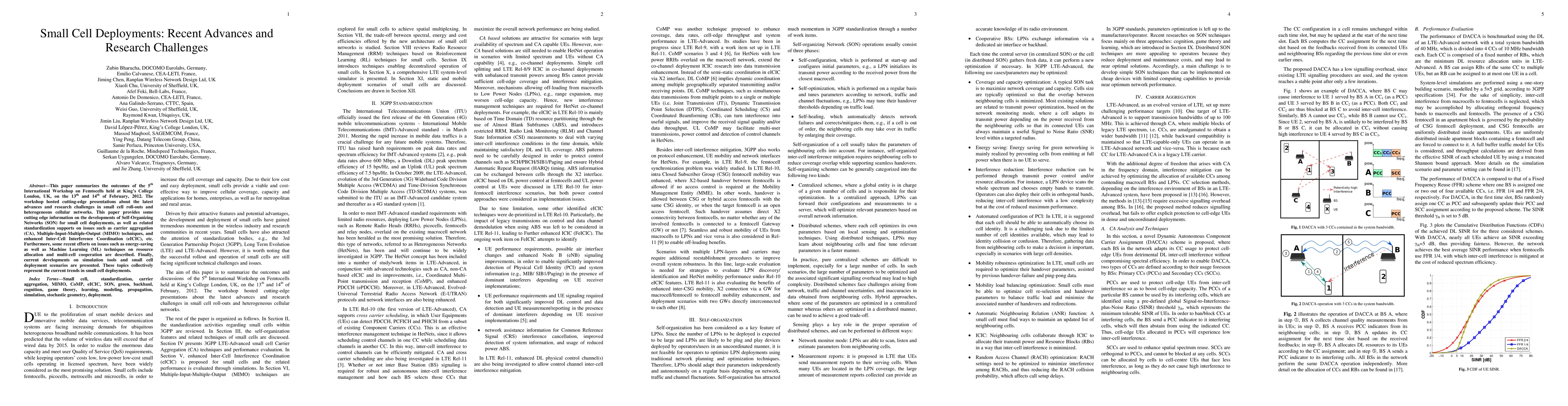 This paper reviews recent advances and challenges in small cell deployments, highlighting developments in Self-Organizing Networks, carrier aggregation, MIMO, and eICIC, alongside energy-saving and Machine Learning techniques. It also covers simulation tools and deployment scenarios discussed at the 5th International Workshop on Femtocells.