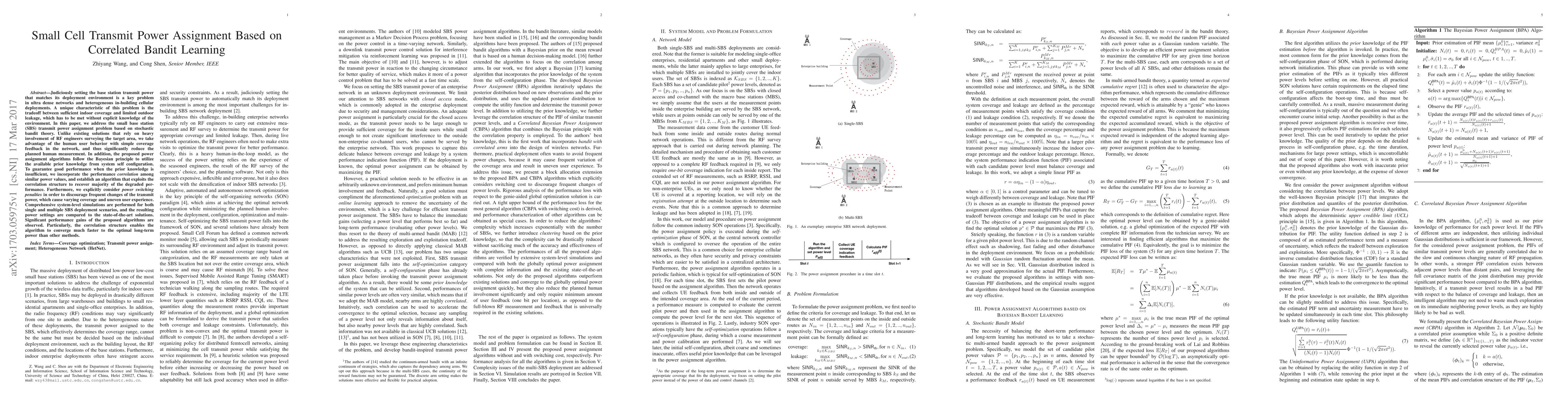 Judiciously setting the base station transmit power that matches its deployment environment is a key problem in ultra dense networks and heterogeneous in-building cellular deployments. A unique characteristic of this problem is the tradeoff between sufficient indoor coverage and limited outdoor leakage, which has to be met without explicit knowledge of the environment. In this paper, we address the small base station (SBS) transmit power assignment problem based on stochastic bandit theory. Unlike existing solutions that rely on heavy involvement of RF engineers surveying the target area, we take advantage of the human user behavior with simple coverage feedback in the network, and thus significantly reduce the planned human measurement. In addition, the proposed power assignment algorithms follow the Bayesian principle to utilize the available prior knowledge from system self configuration. To guarantee good performance when the prior knowledge is insufficient, we incorporate the performance correlation among similar power values, and establish an algorithm that exploits the correlation structure to recover majority of the degraded performance. Furthermore, we explicitly consider power switching penalties in order to discourage frequent changes of the transmit power, which cause varying coverage and uneven user experience. Comprehensive system-level simulations are performed for both single and multiple SBS deployment scenarios, and the resulting power settings are compared to the state-of-the-art solutions. Significant performance gains of the proposed algorithms are observed. Particularly, the correlation structure enables the algorithm to converge much faster to the optimal long-term power than other methods.