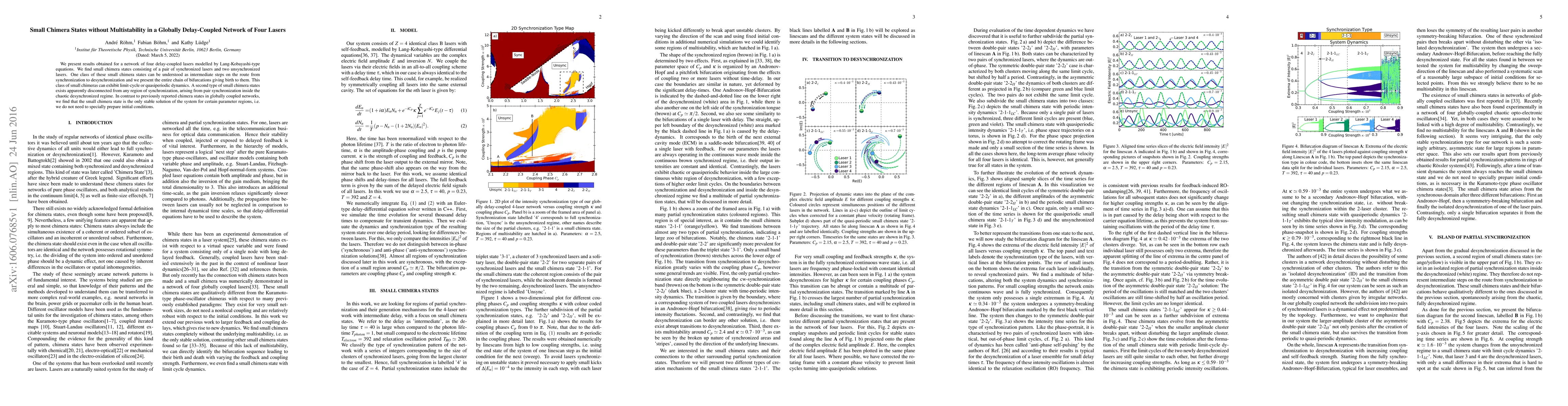 This paper investigates a network of four delay-coupled lasers, revealing small chimera states where two lasers synchronize while the others remain unsynchronized. Unlike previous findings, these states are stable without requiring specific initial conditions.