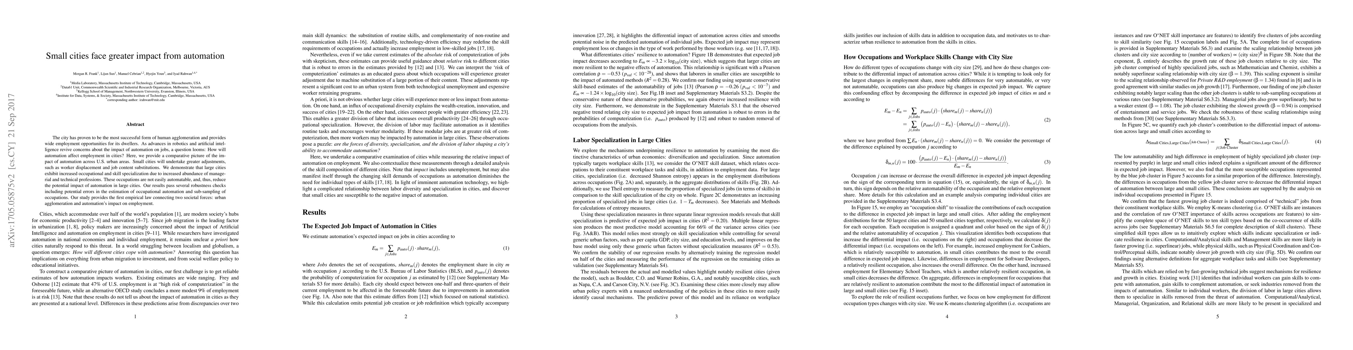 Small cities face greater job displacement due to automation, while large cities benefit from increased occupational specialization, reducing automation's impact. Urban agglomeration enhances the resilience of large cities to automation.