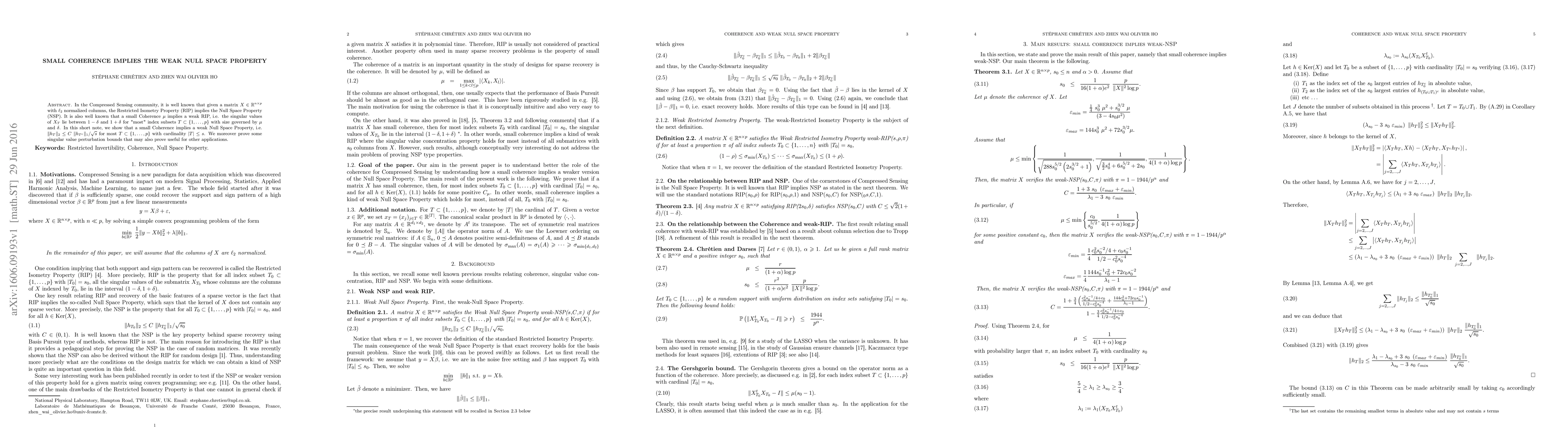 This paper demonstrates that a matrix with small coherence implies a weak Null Space Property, showing that $\Vert h_T\Vert_2 \le C \ \Vert h_{T^c}\Vert_1/\sqrt{s}$ for most subsets $T$ of size $\le s$. Additionally, it provides singular value perturbation bounds that could be useful for other applications.