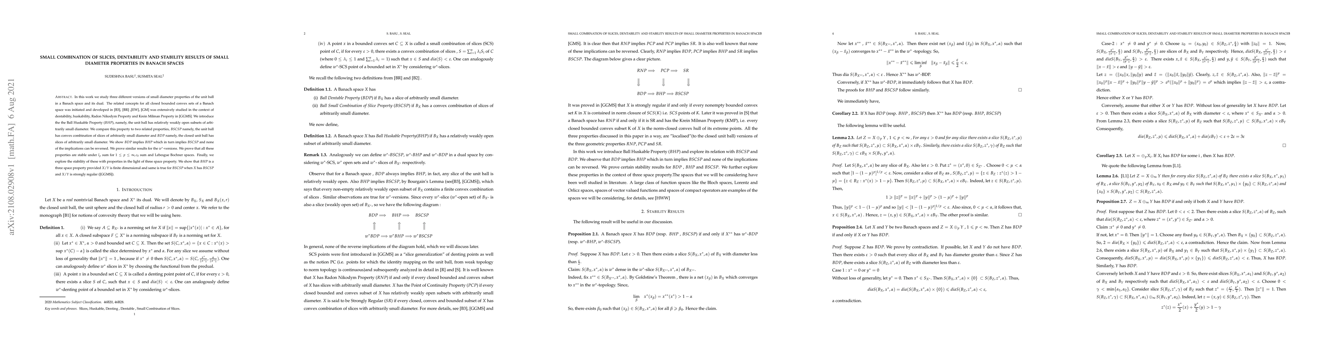 In this work we study three different versions of small diameter properties of the unit ball in a Banach space and its dual. The related concepts for all closed bounded convex sets of a Banach space was initiated and developed in \cite{B3}, \cite{BR} ,\cite{EW}, \cite{GM} was extensively studied in the context of dentability, huskability, Radon Nikodym Property and Krein Milman Property in \cite{GGMS}. We introduce the the Ball Huskable Property ($BHP$), namely, the unit ball has relatively weakly open subsets of arbitrarily small diameter. We compare this property to two related properties, $BSCSP$ namely, the unit ball has convex combination of slices of arbitrarily small diameter and $BDP$ namely, the closed unit ball has slices of arbitrarily small diameter. We show $BDP$ implies $BHP$ which in turn implies $BSCSP$ and none of the implications can be reversed. We prove similar results for the $w^*$-versions. We prove that all these properties are stable under $l_p$ sum for $1\leq p \leq \infty, c_0$ sum and Lebesgue Bochner spaces. Finally, we explore the stability of these with properties in the light of three space property. We show that $BHP$ is a three space property provided $X/Y$ is finite dimensional and same is true for $BSCSP$ when $X$ has $BSCSP$ and $X/Y$ is strongly regular (\cite{GGMS}).