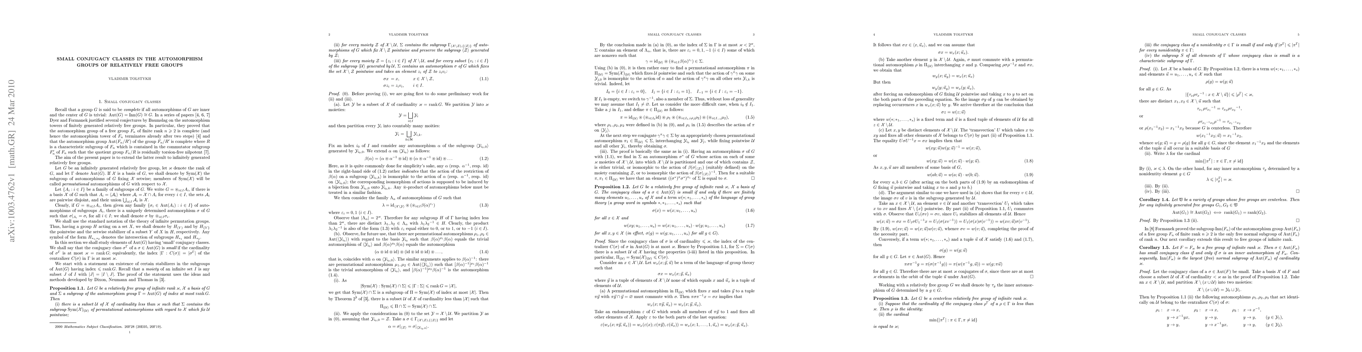 This paper proves that the automorphism group of an infinitely generated free solvable group of derived length at least two is complete, extending Dyer and Formanek's 1977 result for finitely generated groups. It focuses on conditions under which the automorphism group exhibits small conjugacy classes.