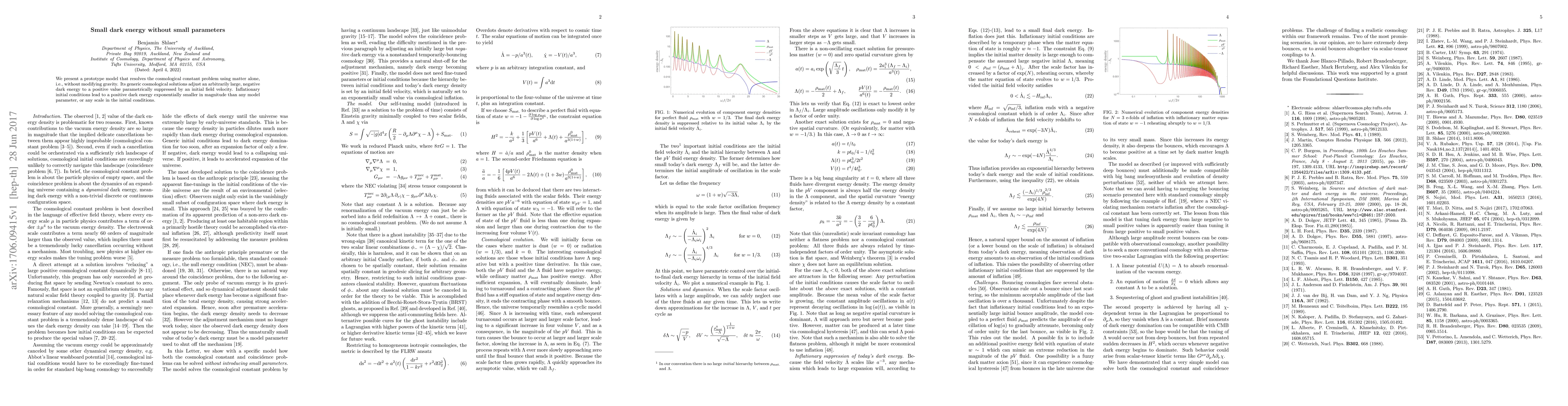 We present a prototype model that resolves the cosmological constant problem using matter alone, i.e., without modifying gravity. Its generic cosmological solutions adjust an arbitrarily large, negative dark energy to a positive value parametrically suppressed by an initial field velocity. Inflationary initial conditions lead to a positive dark energy exponentially smaller in magnitude than any model parameter, or any scale in the initial conditions.