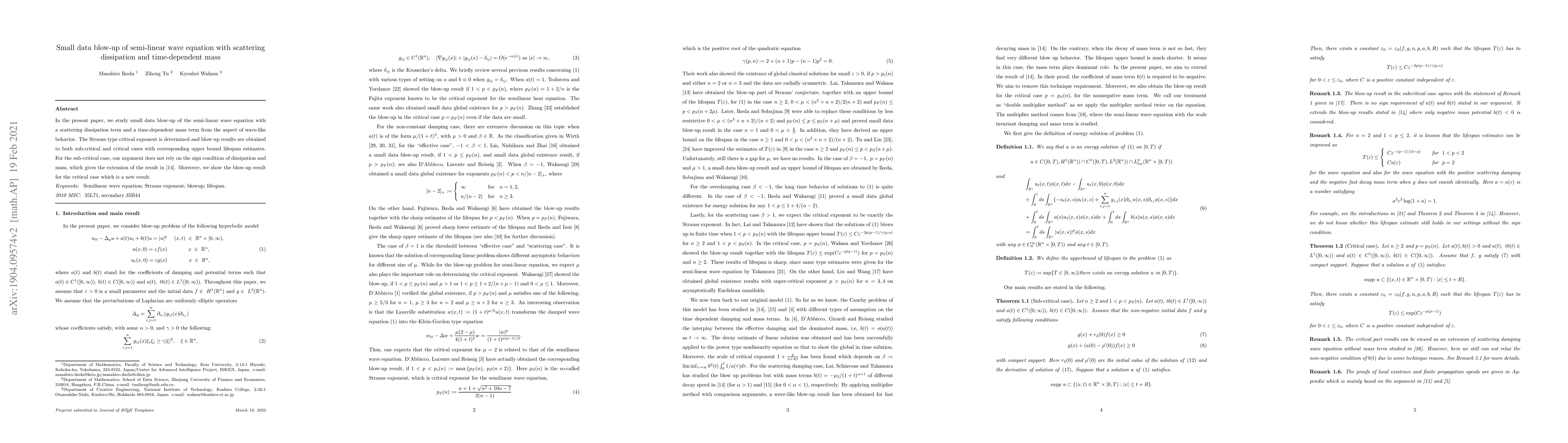 This paper studies how a type of wave equation can blow up in time for small initial data, even when there is some energy loss or a changing mass over time. The researchers find new results for the case where the energy loss or changing mass is just enough to cause a blow-up.