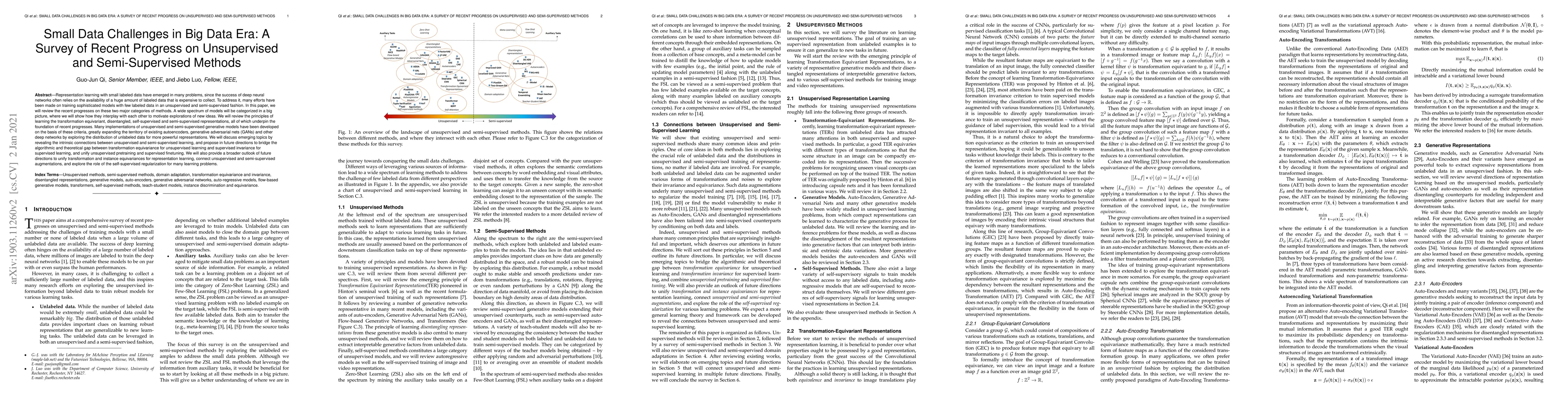 Representation learning with small labeled data have emerged in many problems, since the success of deep neural networks often relies on the availability of a huge amount of labeled data that is expensive to collect. To address it, many efforts have been made on training sophisticated models with few labeled data in an unsupervised and semi-supervised fashion. In this paper, we will review the recent progresses on these two major categories of methods. A wide spectrum of models will be categorized in a big picture, where we will show how they interplay with each other to motivate explorations of new ideas. We will review the principles of learning the transformation equivariant, disentangled, self-supervised and semi-supervised representations, all of which underpin the foundation of recent progresses. Many implementations of unsupervised and semi-supervised generative models have been developed on the basis of these criteria, greatly expanding the territory of existing autoencoders, generative adversarial nets (GANs) and other deep networks by exploring the distribution of unlabeled data for more powerful representations. We will discuss emerging topics by revealing the intrinsic connections between unsupervised and semi-supervised learning, and propose in future directions to bridge the algorithmic and theoretical gap between transformation equivariance for unsupervised learning and supervised invariance for supervised learning, and unify unsupervised pretraining and supervised finetuning. We will also provide a broader outlook of future directions to unify transformation and instance equivariances for representation learning, connect unsupervised and semi-supervised augmentations, and explore the role of the self-supervised regularization for many learning problems.