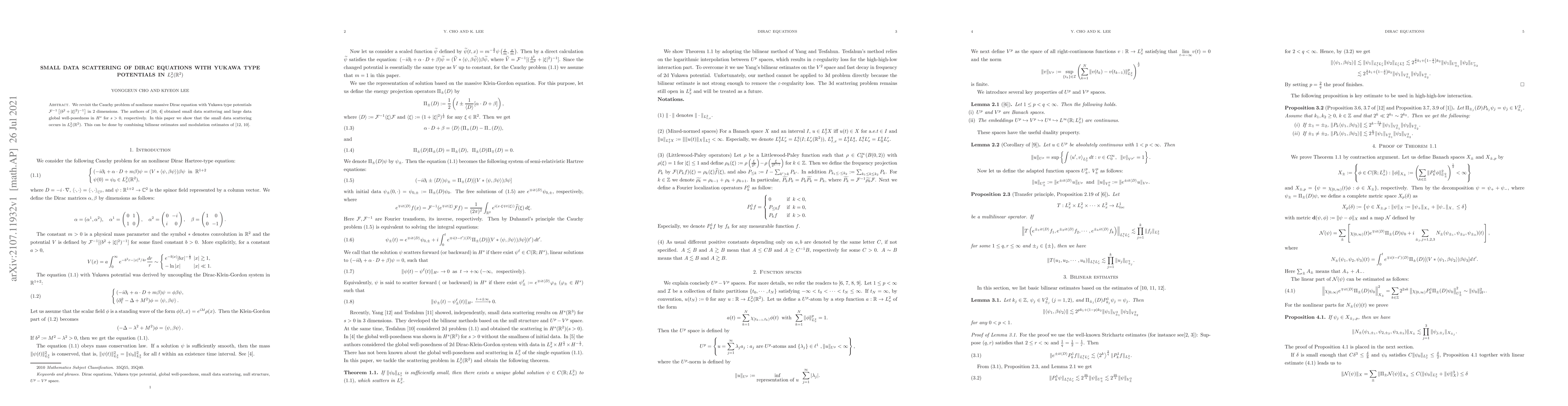 We revisit the Cauchy problem of nonlinear massive Dirac equation with Yukawa type potentials $\mathcal F^{-1}\left[(b^2 + |\xi|^2)^{-1}\right]$ in 2 dimensions. The authors of \cite{tes2d, geosha} obtained small data scattering and large data global well-posedness in $H^s$ for $s > 0$, respectively. In this paper we show that the small data scattering occurs in $L_x^2(\mathbb R^2)$. This can be done by combining bilinear estimates and modulation estimates of \cite{yang, tes2d}.