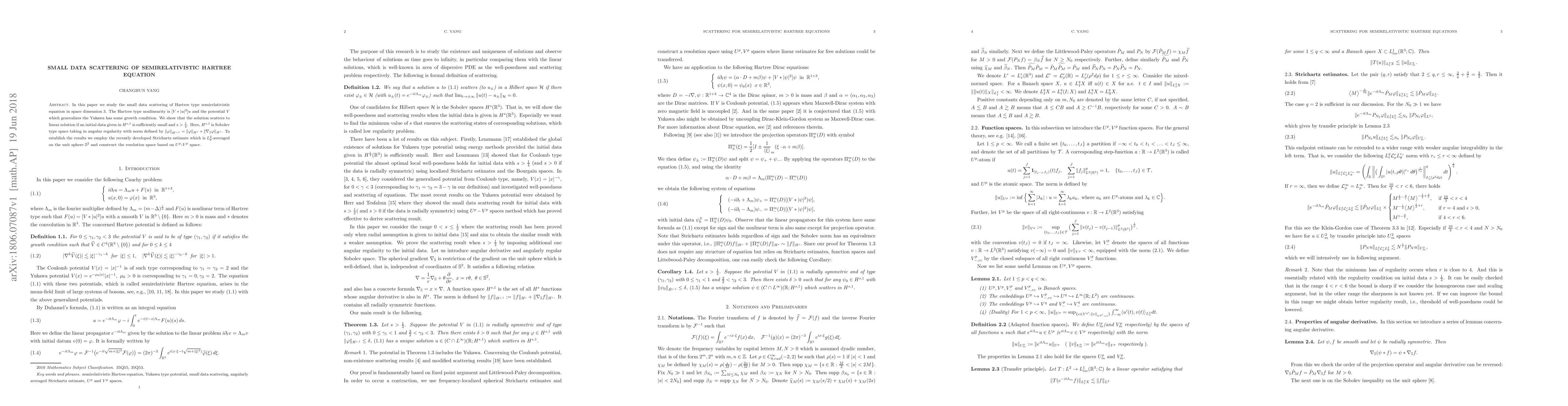 In this paper we study the small data scattering of Hartree type semirelativistic equation in space dimension $3$. The Hartree type nonlinearity is $[V * |u|^2]u$ and the potential $V$ which generalizes the Yukawa has some growth condition. We show that the solution scatters to linear solution if an initial data given in $ H^{s,1}$ is sufficiently small and $s>\frac14$. Here, $H^{s, 1}$ is Sobolev type space taking in angular regularity with norm defined by $\|\varphi\|_{ H^{s, 1}} = \|\varphi\|_{ H^{s}} + \|\nabla_{\mathbb S} \varphi\|_{H^{s}}$. To establish the results we employ the recently developed Strichartz estimate which is $L_\theta^2$-averaged on the unit sphere $\mathbb S^{2}$ and construct the resolution space based on $U^p$-$V^p$ space.