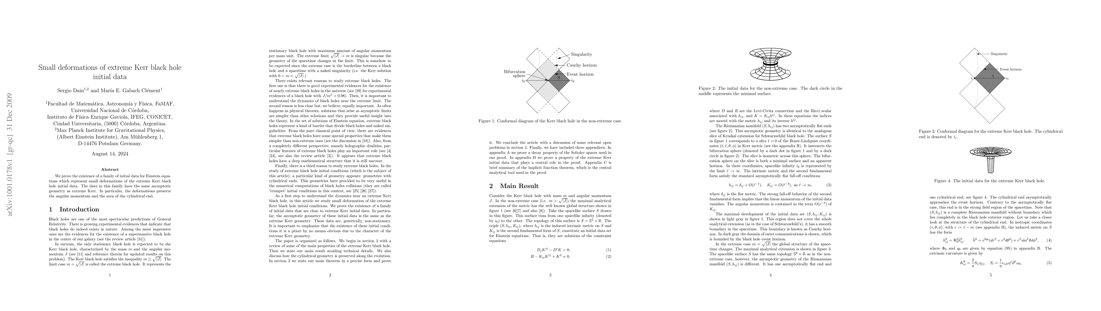 This paper proves the existence of a family of initial data for Einstein's equations that represent small deformations of extreme Kerr black hole initial data, maintaining the same asymptotic geometry, angular momentum, and cylindrical end area.