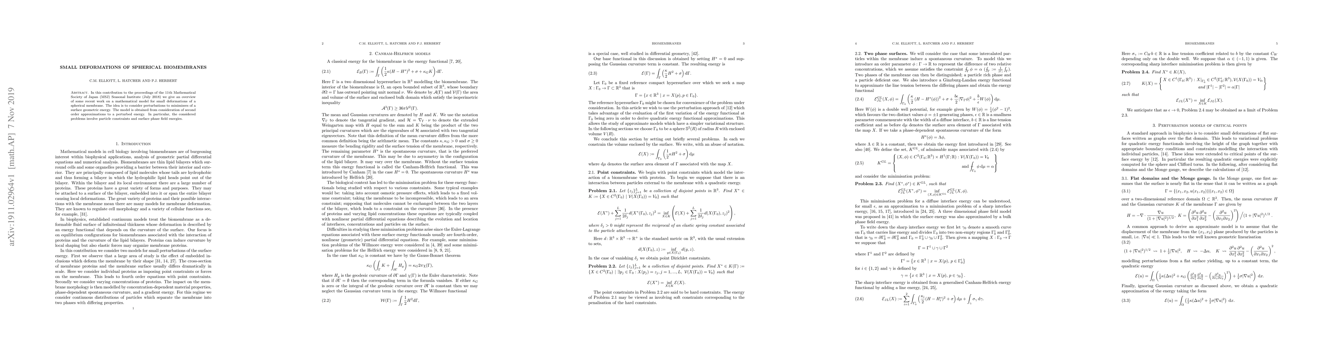 In this contribution to the proceedings of the 11th Mathematical Society of Japan (MSJ) Seasonal Institute (July 2018) we give an overview of some recent work on a mathematical model for small deformations of a spherical membrane. The idea is to consider perturbations to minimisers of a surface geometric energy. The model is obtained from consideration of second order approximations to a perturbed energy. In particular, the considered problems involve particle constraints and surface phase field energies.