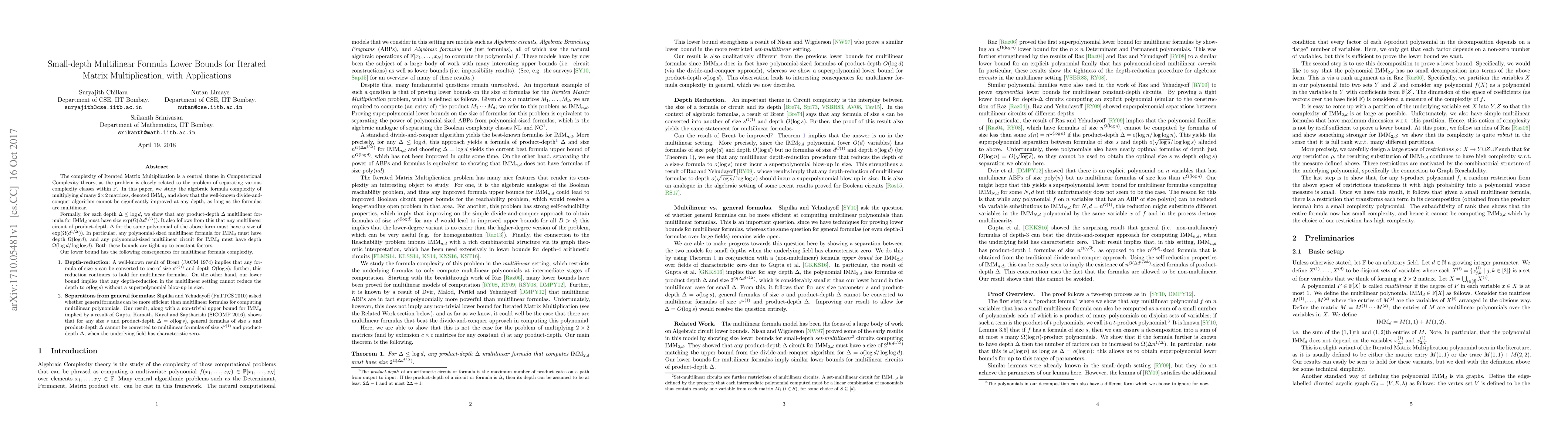 In this paper, we study the algebraic formula complexity of multiplying $d$ many $2\times 2$ matrices, denoted $\mathrm{IMM}_{d}$, and show that the well-known divide-and-conquer algorithm cannot be significantly improved at any depth, as long as the formulas are multilinear. Formally, for each depth $\Delta \leq \log d$, we show that any product-depth $\Delta$ multilinear formula for $\mathrm{IMM}_d$ must have size $\exp(\Omega(\Delta d^{1/\Delta})).$ It also follows from this that any multilinear circuit of product-depth $\Delta$ for the same polynomial of the above form must have a size of $\exp(\Omega(d^{1/\Delta})).$ In particular, any polynomial-sized multilinear formula for $\mathrm{IMM}_d$ must have depth $\Omega(\log d)$, and any polynomial-sized multilinear circuit for $\mathrm{IMM}_d$ must have depth $\Omega(\log d/\log \log d).$ Both these bounds are tight up to constant factors. 1. Depth-reduction: A well-known result of Brent (JACM 1974) implies that any formula of size $s$ can be converted to one of size $s^{O(1)}$ and depth $O(\log s)$; further, this reduction continues to hold for multilinear formulas. Our lower bound implies that any depth-reduction in the multilinear setting cannot reduce the depth to $o(\log s)$ without a superpolynomial blow-up in size. 2. Separations from general formulas: Our result, along with a non-trivial upper bound for $\mathrm{IMM}_{d}$ implied by a result of Gupta, Kamath, Kayal and Saptharishi (SICOMP 2016), shows that for any size $s$ and product-depth $\Delta = o(\log s),$ general formulas of size $s$ and product-depth $\Delta$ cannot be converted to multilinear formulas of size $s^{\omega(1)}$ and product-depth $\Delta,$ when the underlying field has characteristic zero.