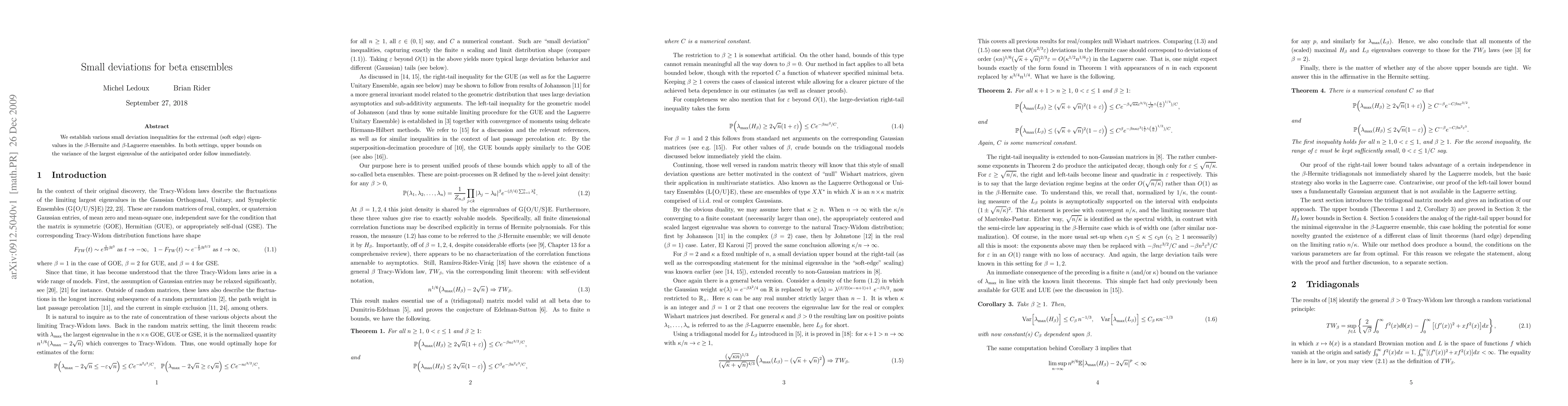 This paper establishes small deviation inequalities for extremal eigenvalues in beta-Hermite and beta-Laguerre ensembles, providing upper bounds on the variance of the largest eigenvalue.