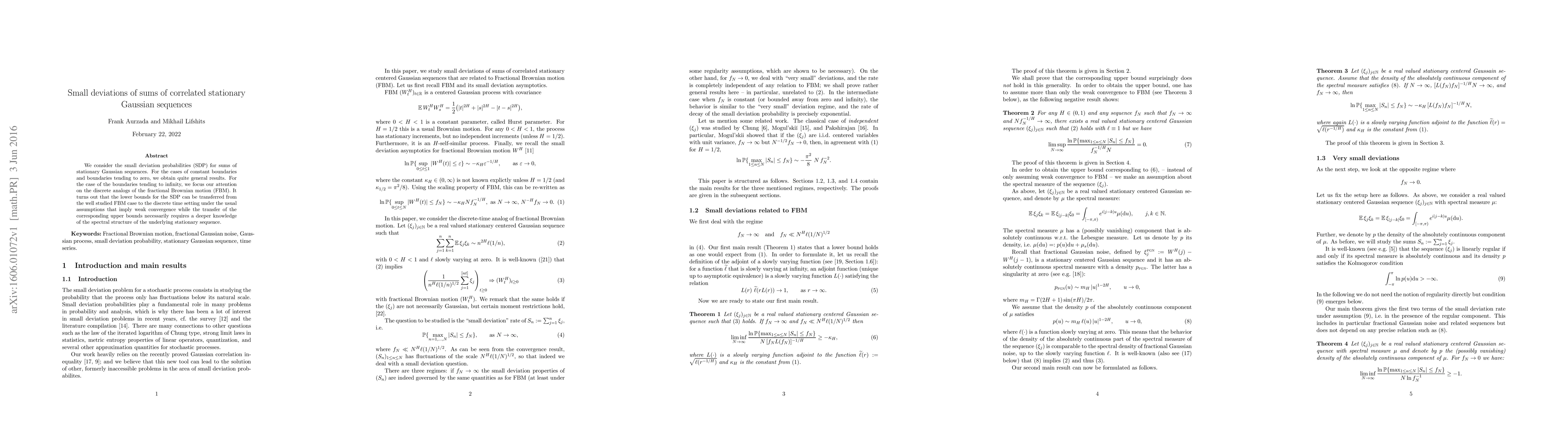 The paper presents a detailed analysis of small deviation probabilities for sums of correlated stationary Gaussian sequences, including general results for different boundary conditions and a novel perturbation technique for the spectral measure of fractional Gaussian noise.
